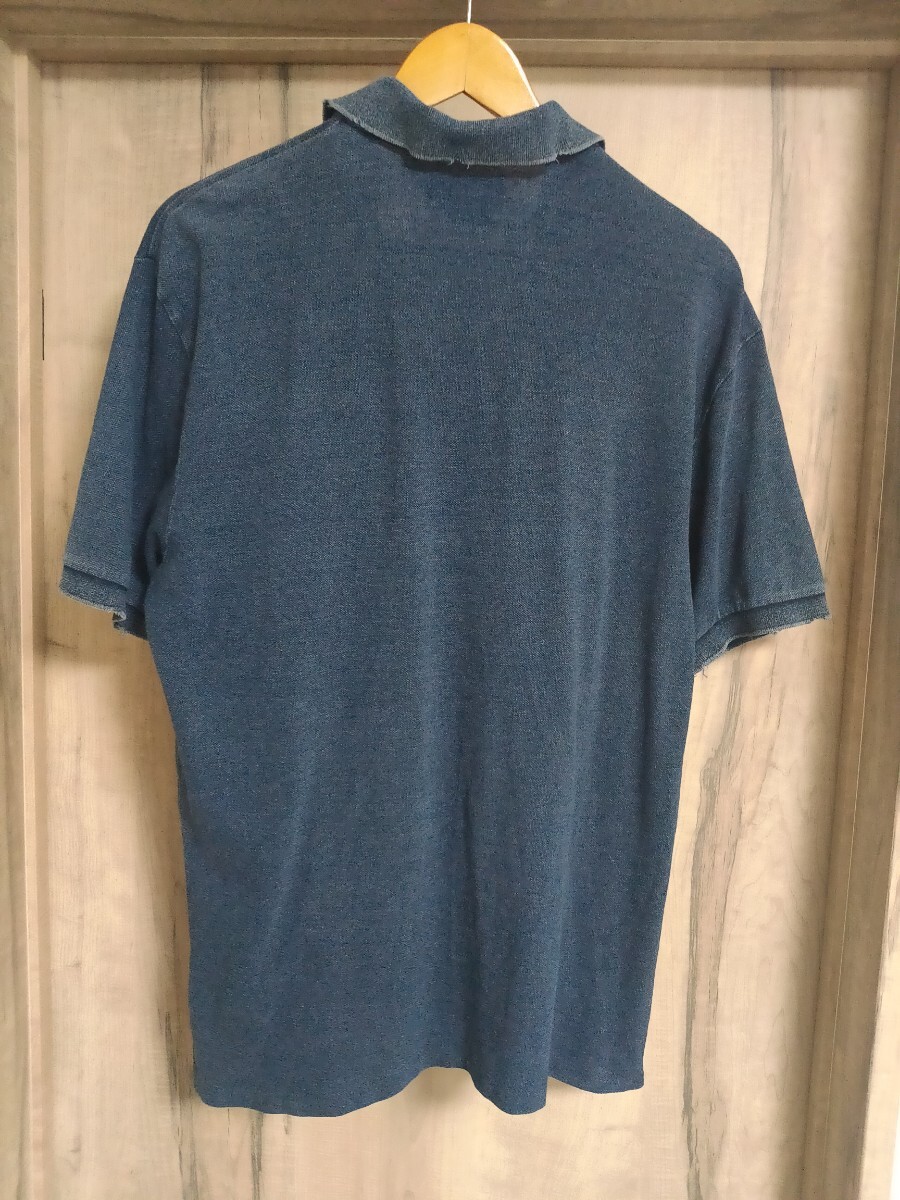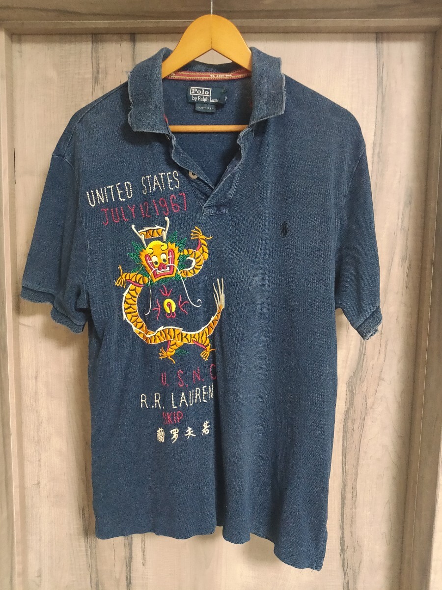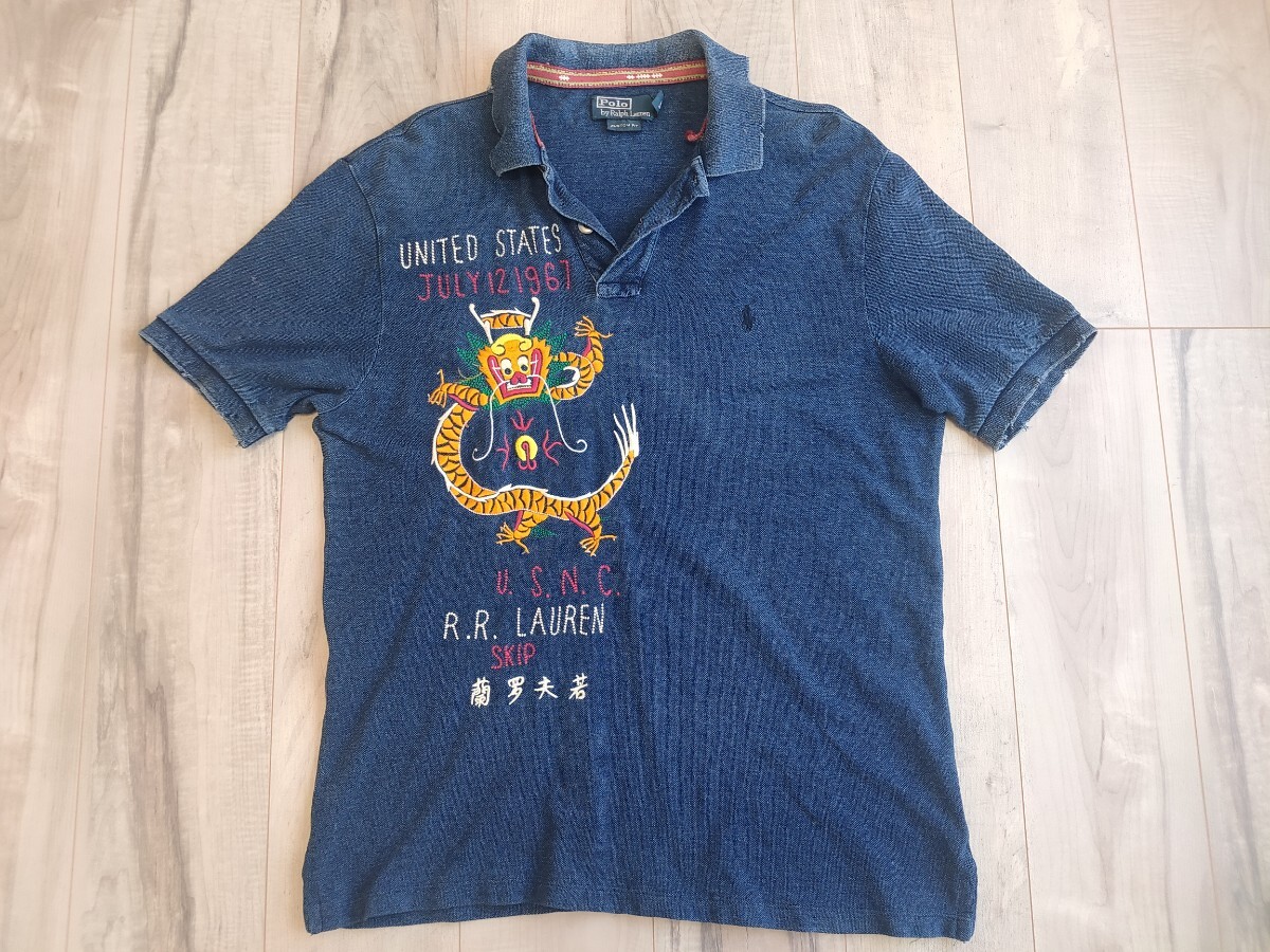 ラルフローレンのインディゴ染めのポロシャツです。素材は100%コットンです。胸元にUSMCの龍の刺繍が施されています。2000年代初頭のモデルです。