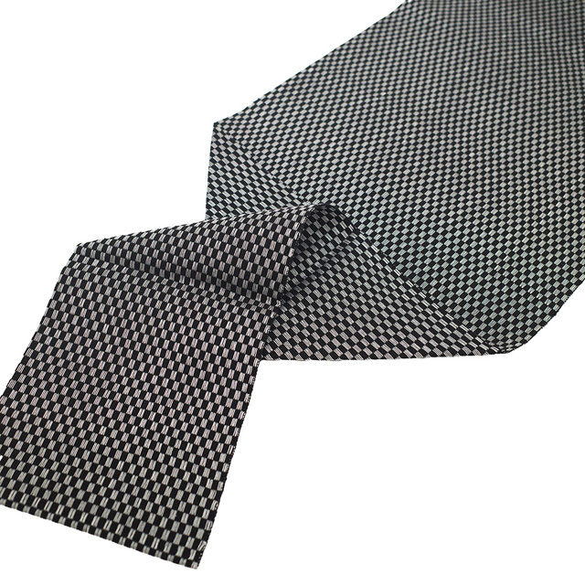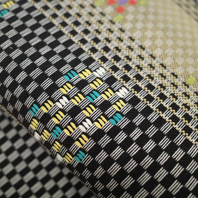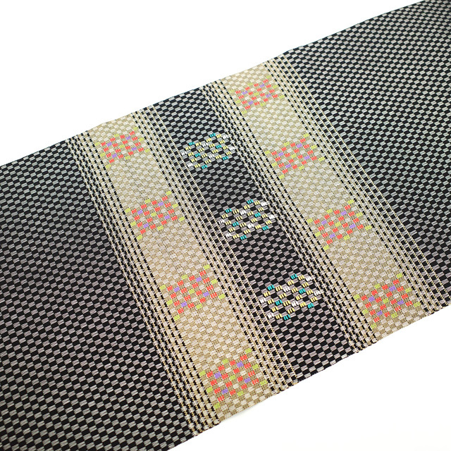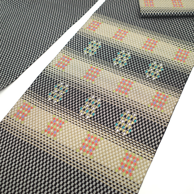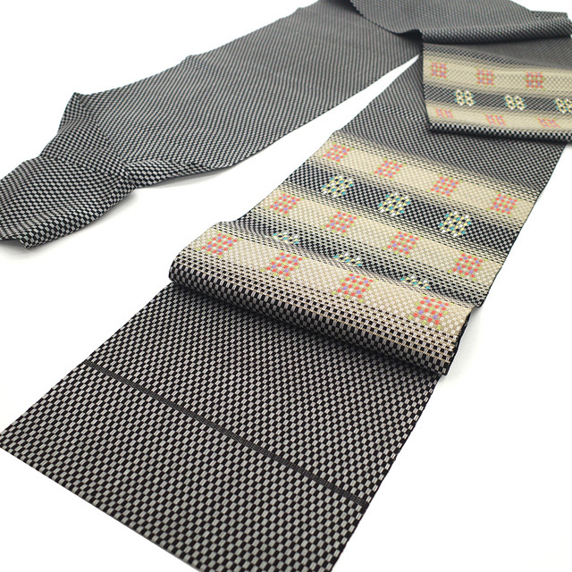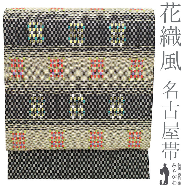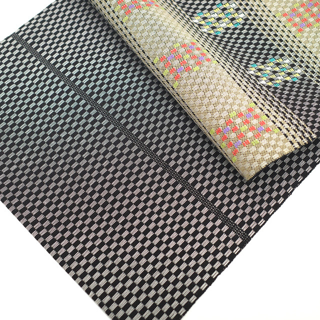 【新古品】 名古屋帯 未使用 正絹 八寸 花織風 黒 市松 花絣 カジュアル 春 秋 冬 スリーシーズン 上質 なごや帯 仕立て上がり みやがわ sb54185