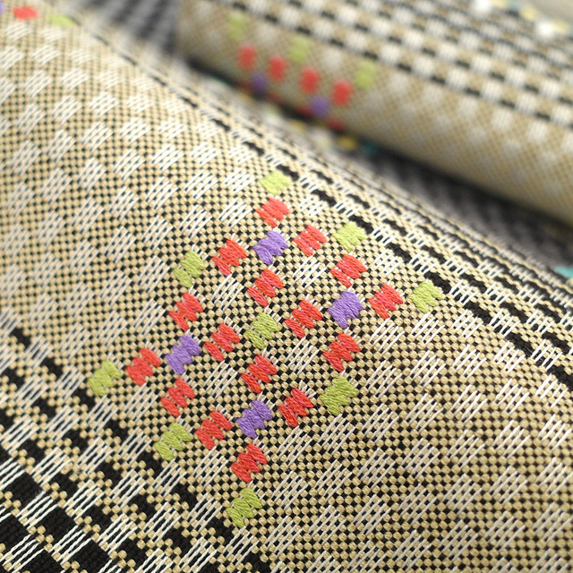 やさしい多彩なお色で 花織風に花絣が織り上げられています。