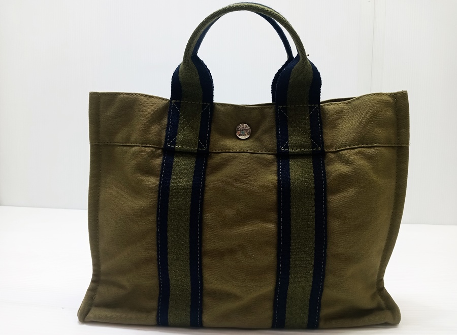 下松)【美品】HERMES エルメス フールトゥPM キャンバス トートバッグ カーキ ◆N2509009 NJ02A