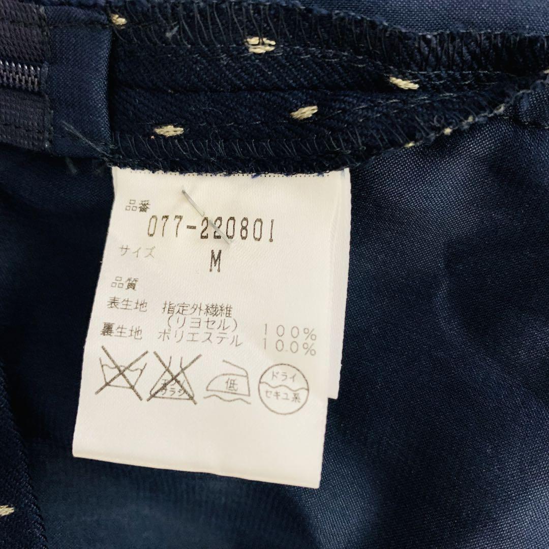 ネイビーのドット柄フレアスカート、ウエスト70cm、丈56cmで、シンプルながらスタイリッシュなデザイン。