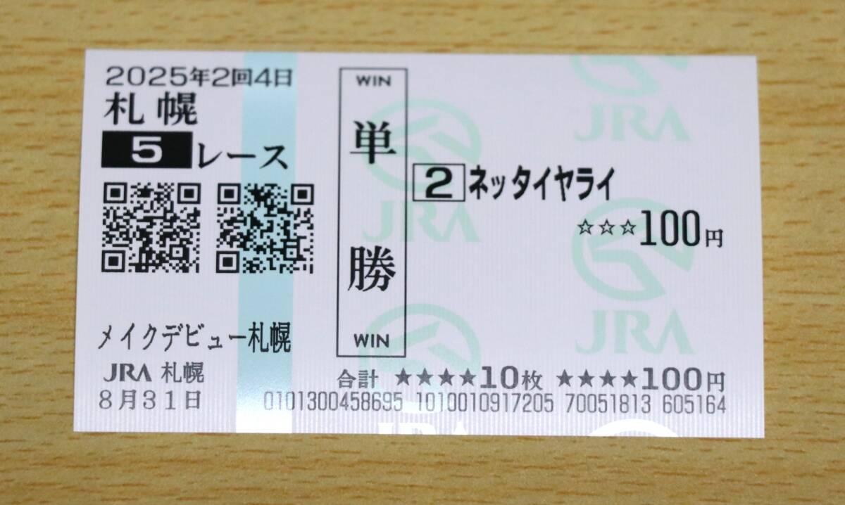 ネッタイヤライ メイクデビュー札幌 5R (2025年8/31) 現地単勝馬券(札幌競馬場)です。気に入って頂けた方の落札を心よりお待ちしております。 商品は定型郵便(110円)又は又はゆうパケットポストminiで発送となります。 厚さの関係上、定型郵便の場合は片面段ボール補強、ゆうパケットポストの場合は両面段ボール補強となります。どうかよろしくお願い致します。