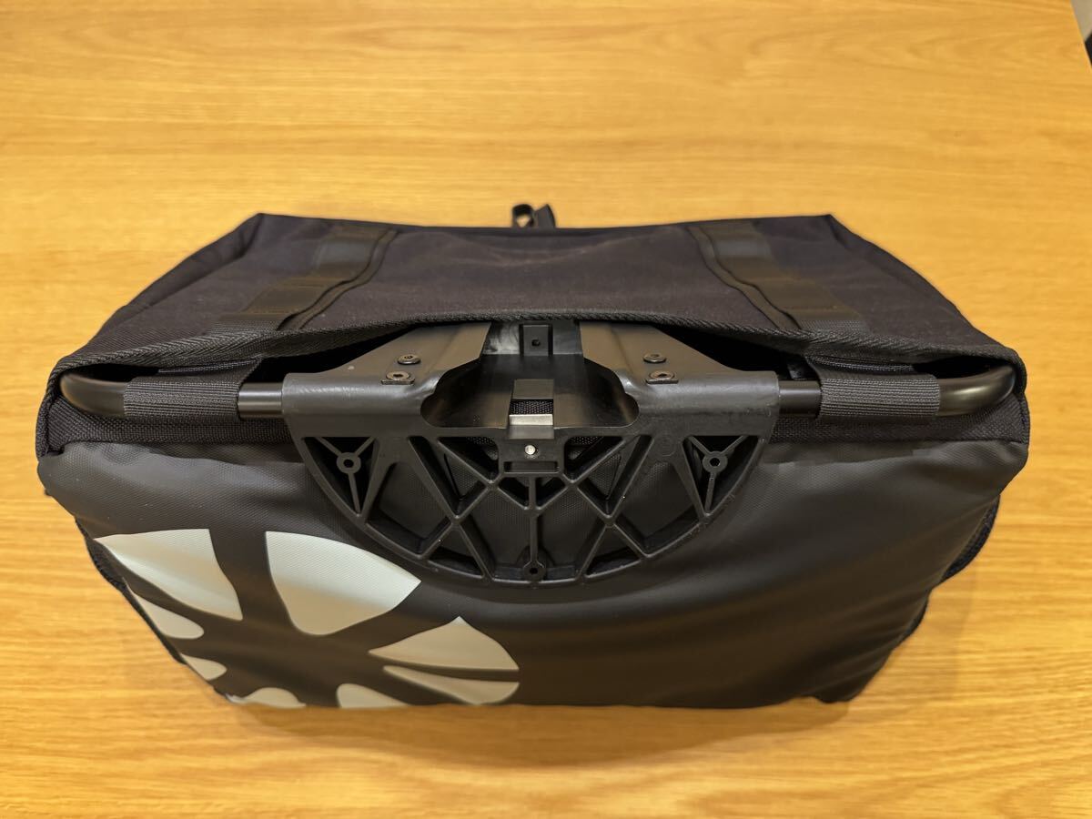 このバッグは、キャリアフレーム内蔵でしっかり固定。ワンタッチで着脱出来できます。ブロックアダプターによりヘッド台座部に装着するため、積載物の重さでハンドルを取られることもほとんどありません。