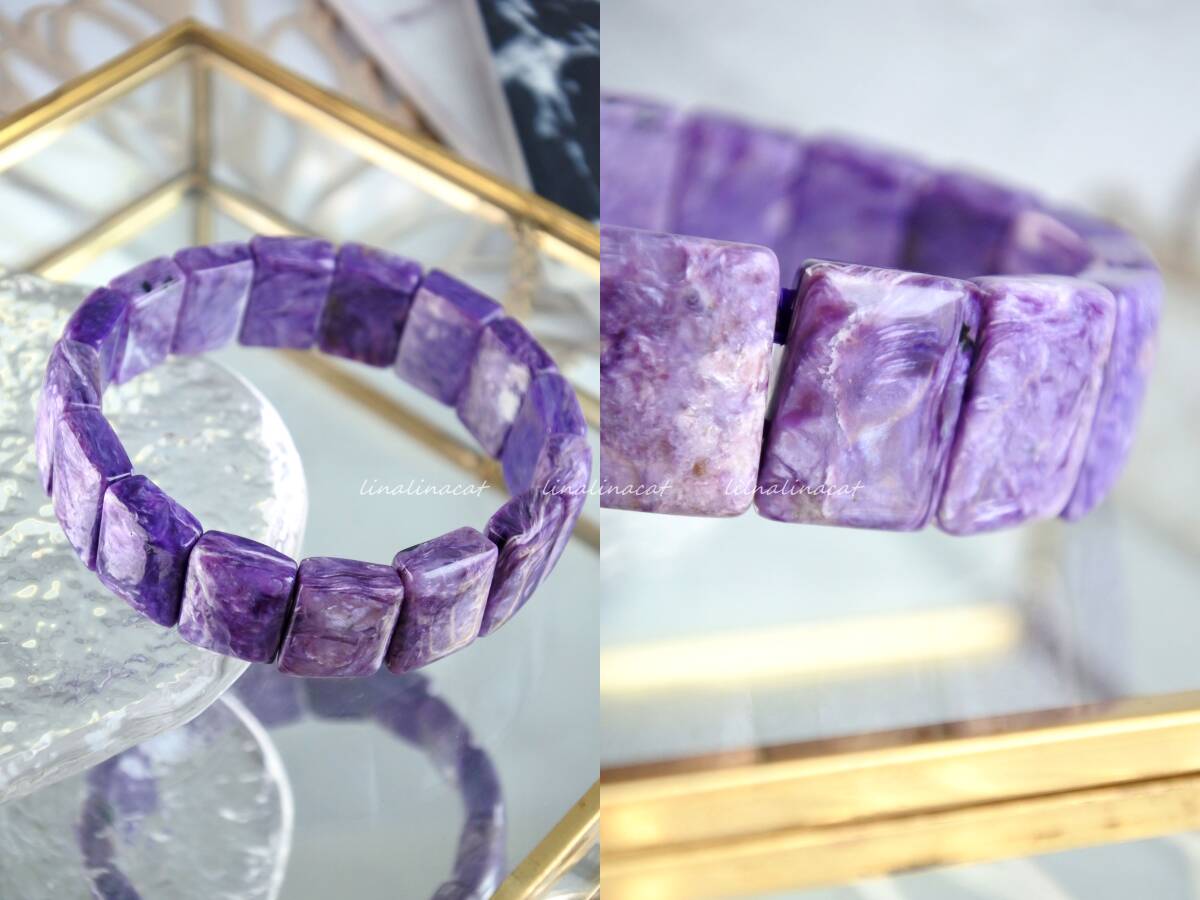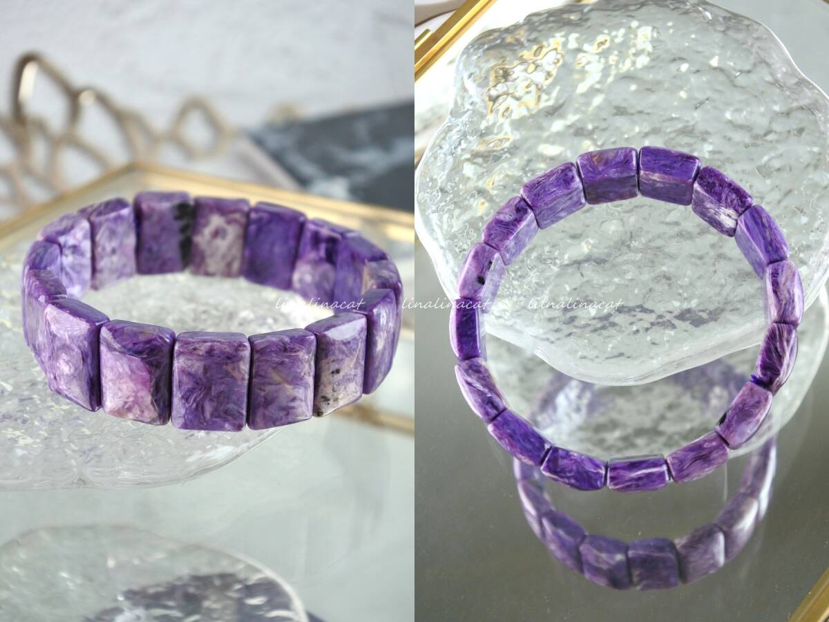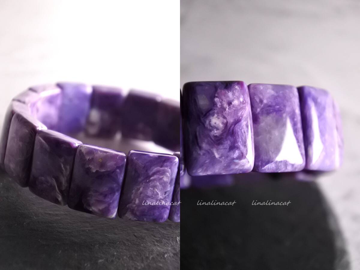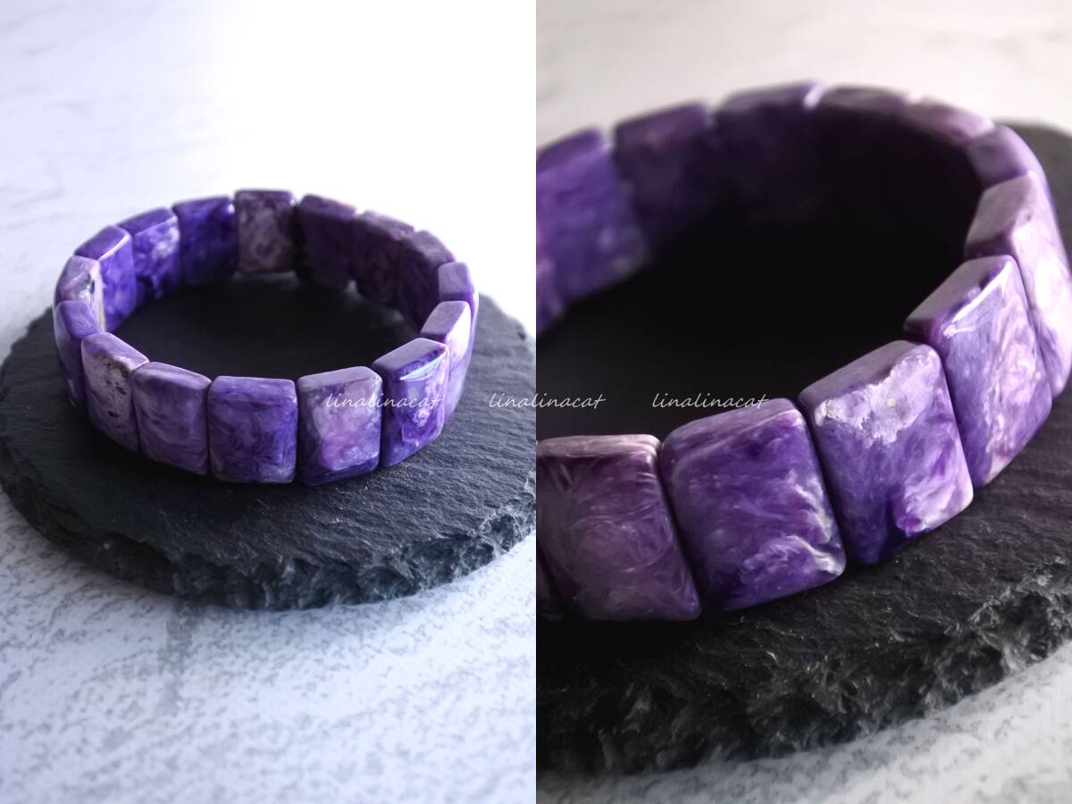 天然石ブレスレット ② AAA チャロアイト バングル パワーストーン ヒーリング 癒し 浄化 ストレス 17.5㎝ 17㎜×12㎜(1ピースの大きさ) バングルタイプで少し大き目のサイズとなっておりますので、男性、女性ともにお勧めのお品です。 チャロアイト特有のとろけるような美しい紫のマーブル模様が堪能できます。 稀にシリカも混ざっており、紫の部分とシリカの透明感のある部分が何とも言えず絶妙な美しさを醸し出しています。 気高い天使のオーラの様な癒しを感じていただけると思います。 「チャロアイト」は、「スギライト」や「ラリマー」と同じく、世界三大ヒーリングストーンの一つに数えられる石です。油彩画のような質感を持つ芸術的な印象を持つ石で、この不思議な模様は、黒色:エジリン(Aegirine錐輝石)、帯状の灰色:マイクロクリン(Microcline微斜長石)、白色:カリ長石(PotassiumFeldspar)、黄緑色:カナサイト(Canasite)、淡黄色:ティクナクサイト(Tinaksite)などの鉱物が、マーブル状に混ざりあうことから成り立っています。薄紫色の彩色は不純物のマンガンに起因します。 チャロアイトという名前の由来には、シベリアのチャロ川流域で発見された事とする説と、ロシア語の(Charo魅惑)から名づけられたという説がありますが、後者の方が有力であるとされています。その名の通り、この石の個性的な模様は、見る人を魅了してやみません。まさに、「魅惑の宝石」にぴったりな石です。 ミネラルショーや天然石専門店などで購入したコレクションを多数出品中です。 天然石のためインクルージョンやクラック、欠けなどあるものもあるかと思いますが「気の良い子」ばかり集めていましたのでその子の個性と歴史として気に入ってくださった方にお譲りできれば幸いです。 日常のちょっとしたおしゃれに。 ささやかなお守りとして。 お気に入りを見つけられますように。 気に入っていただけた方に。 | ||