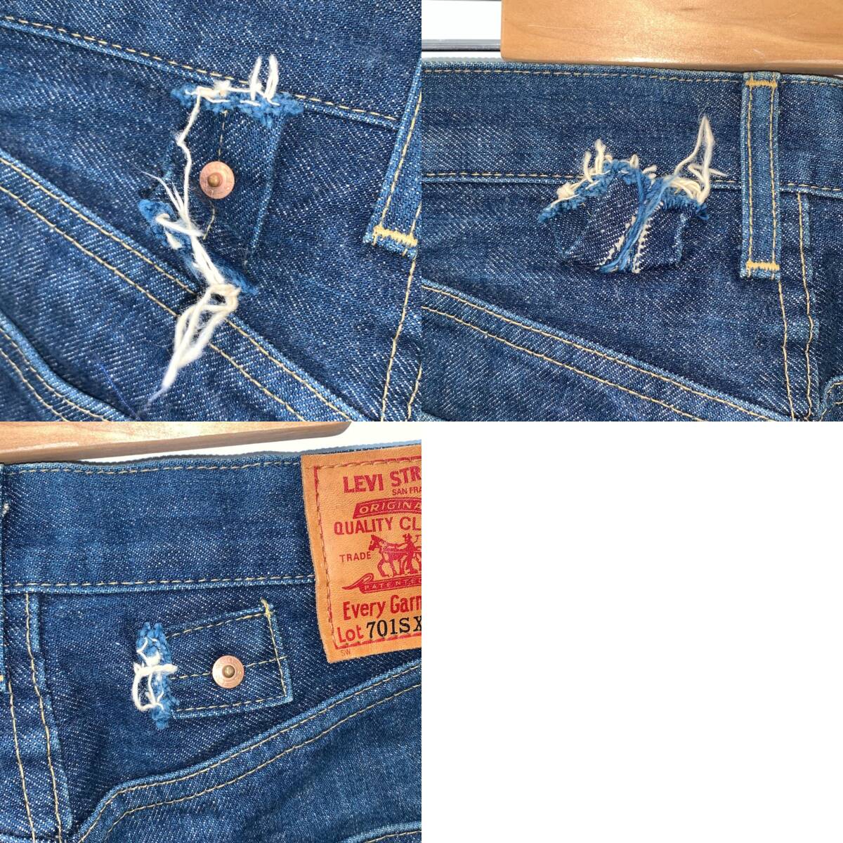 シンチバックが破損しています。 裾が破れています。 ダメージ、退色感は画像をご覧ください。 現状品である旨をご理解いただいたうえで入札をお願いいたします。 ブランド:リーバイス 品番:701SXX 製造国:日本 サイズ:29インチ(W 約33cm、股上 約27cm、股下 約80cm) 素材:綿 100% |