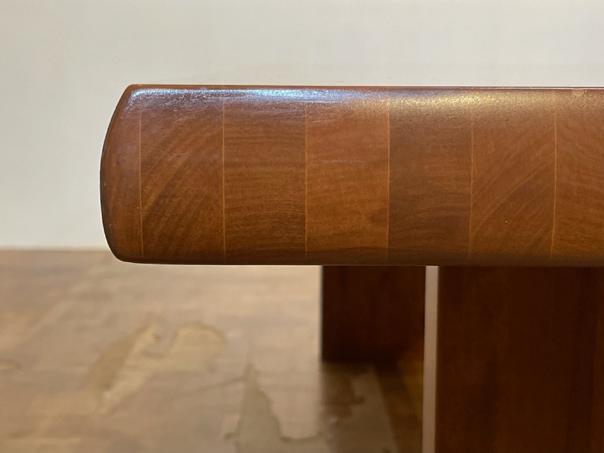 全部位を同肉厚の55mm材で単一に設計しつつ、天板トップやフレーム体裁面に当たる面構成には25mmの小径スライス材を並べることでウォールナット材のみずみずしい杢目の連なりの細やかなリズムで上品にプロダクトを飾っていて秀逸。