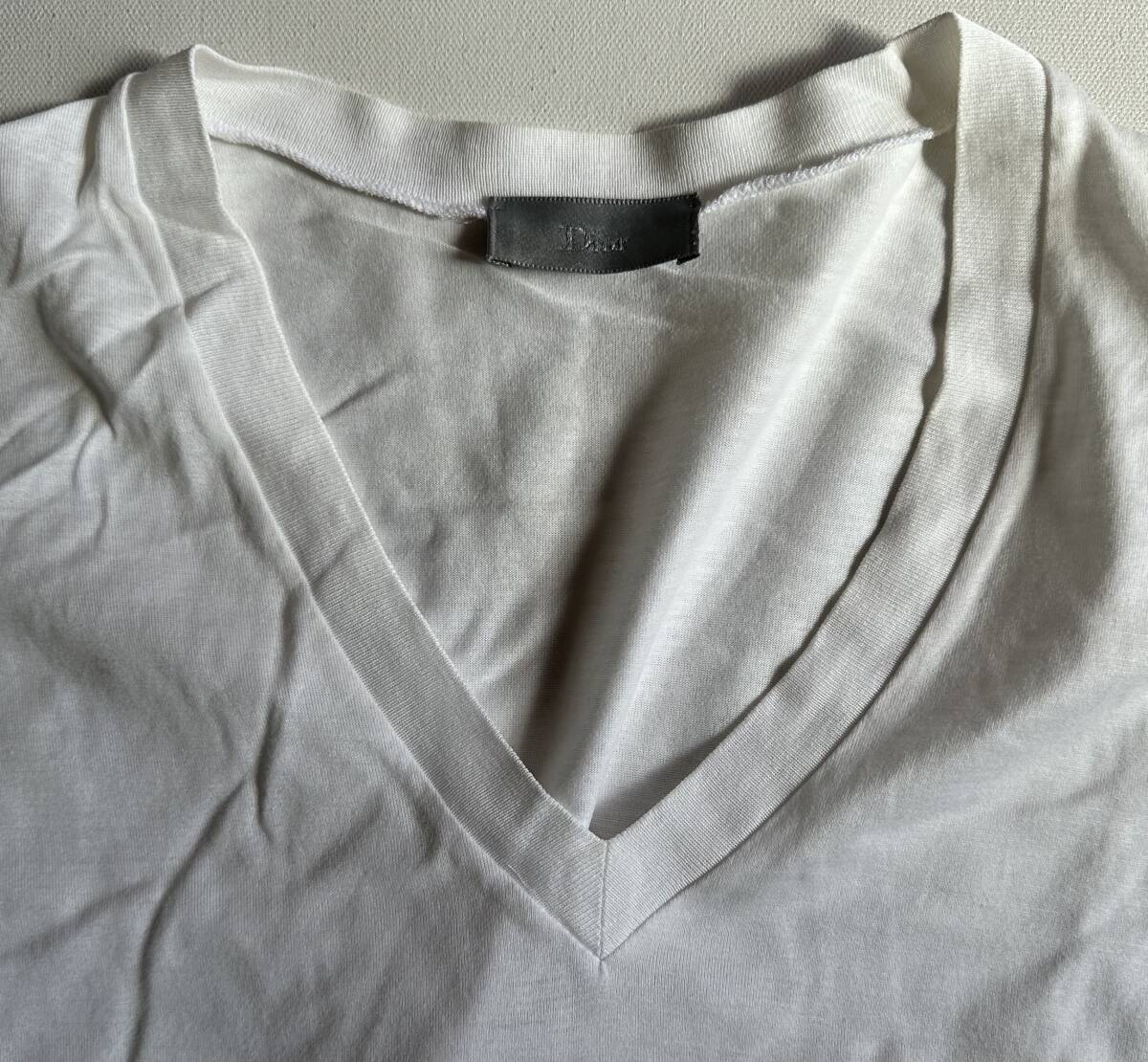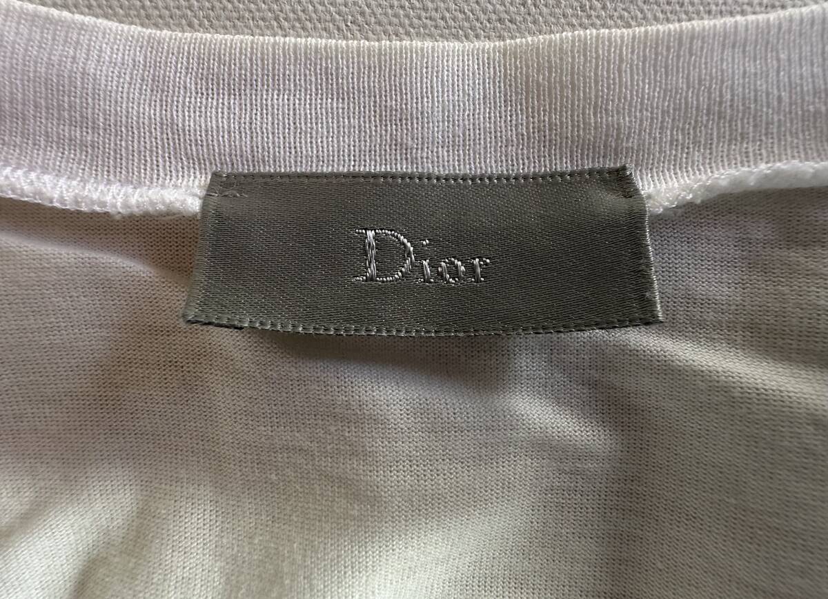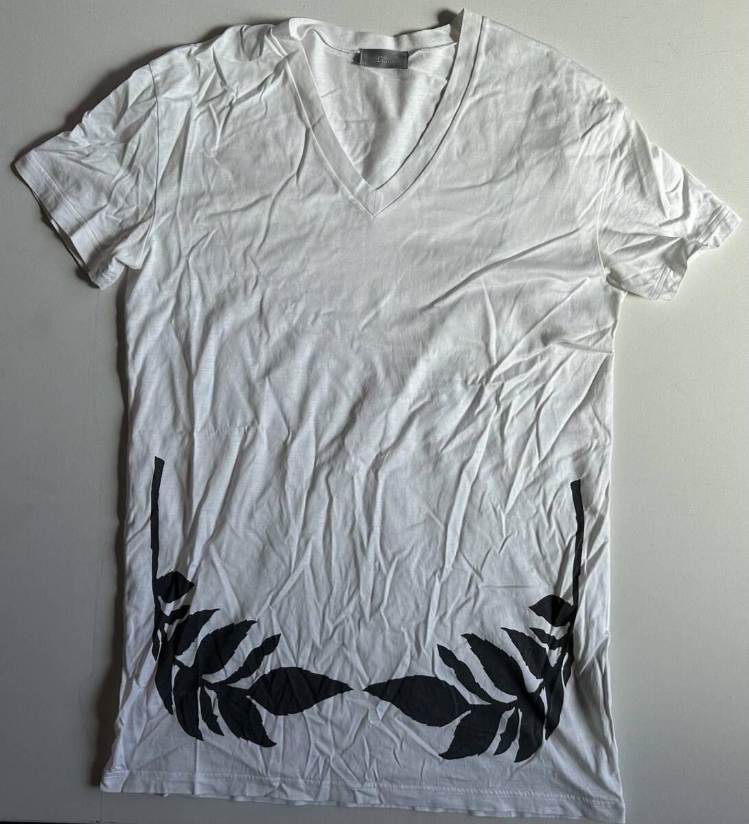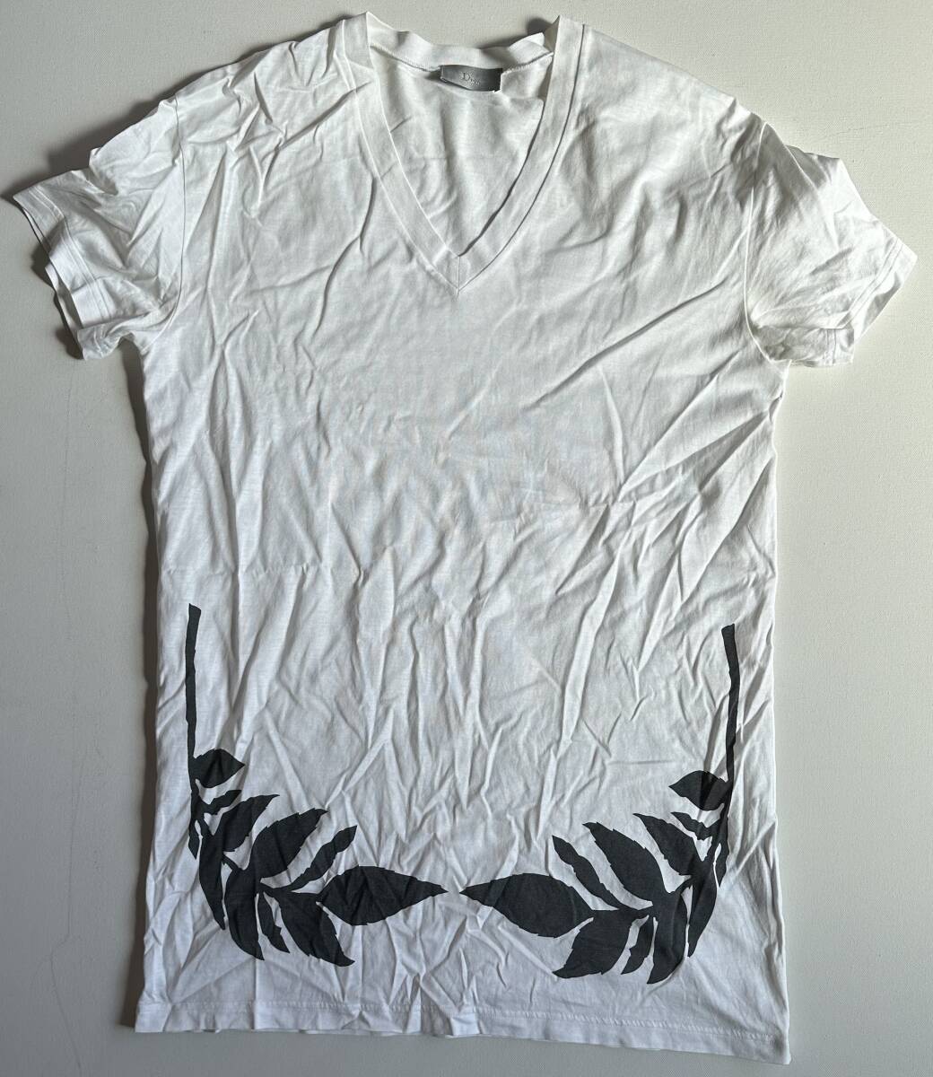 Dior HOMME ディオールオム Vネック 裾リーフデザイン 半袖Tシャツ サイズXXS 美品です。サイズ:Dior HOMME ディオールオム Vネック 裾リーフデザイン 半袖Tシャツ サイズXXS 着丈71cm。肩幅41cm。身幅47cm。袖丈16cm。マテリアル:コットン100%。カラー:オフホワイト。イタリア製。クリス・ヴァン・アッシュのデザインによるものです。サイズ的にはXXSですが、実際の着用感はエディ期のSサイズを彷彿とさせるゆったり感が有ります。状態は10段階で8位です。ご理解頂ける方のみノークレーム・ノーリターンでお願いします。