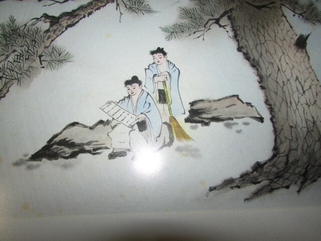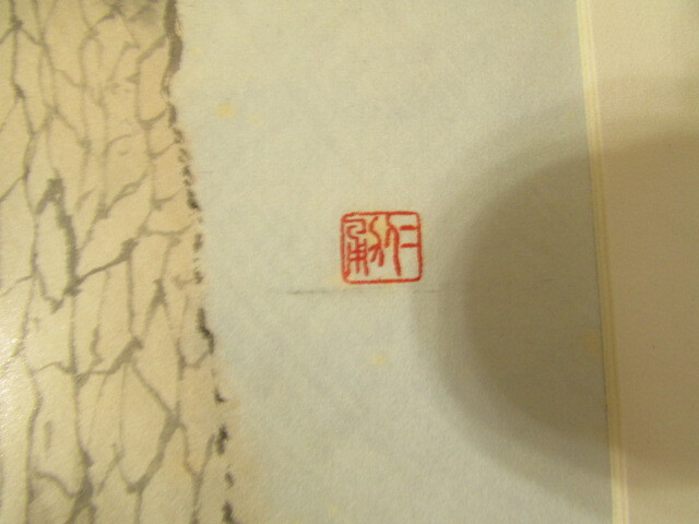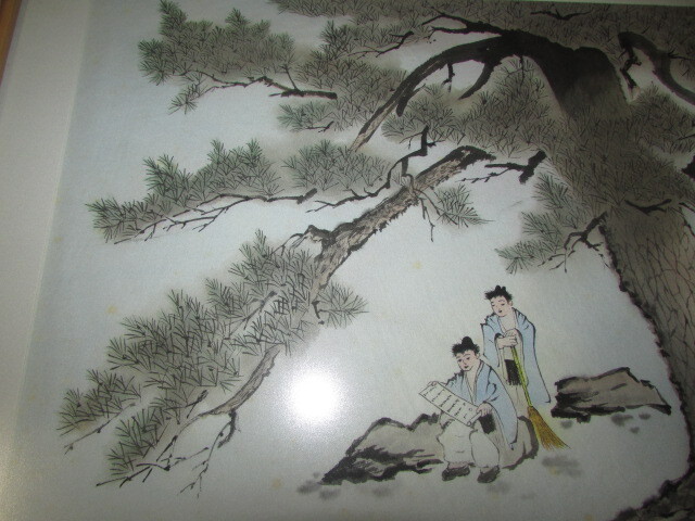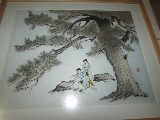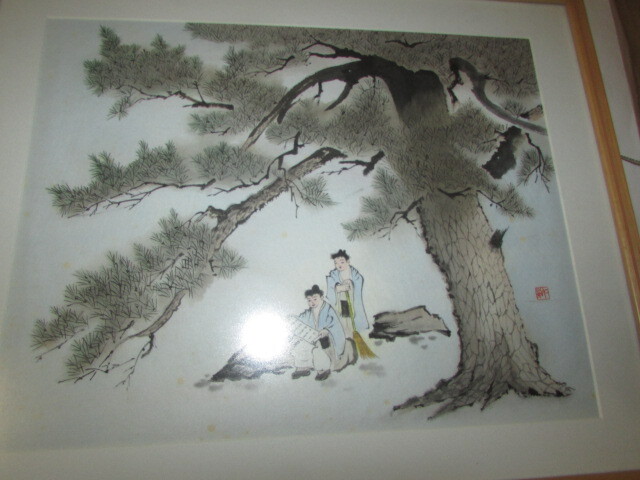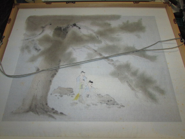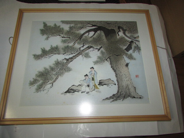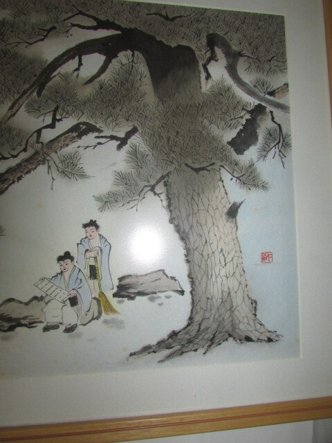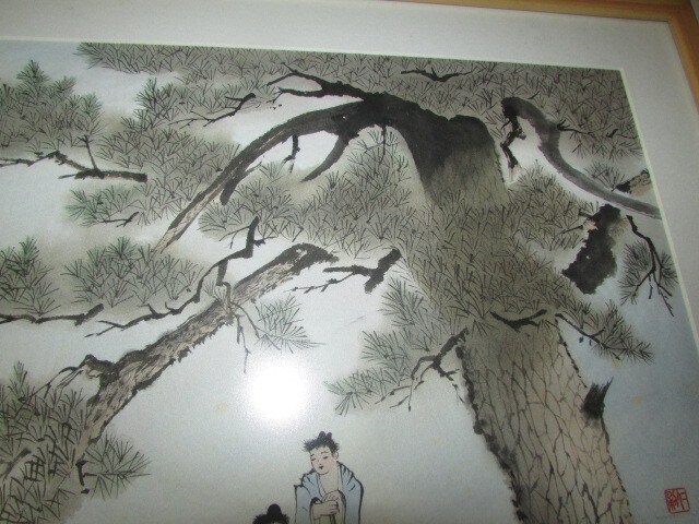 (会津若松・旧家・蔵出し)昭和レトロ ( 作家物印有り・老松の下の人物二人絵画 )貴重・珍品