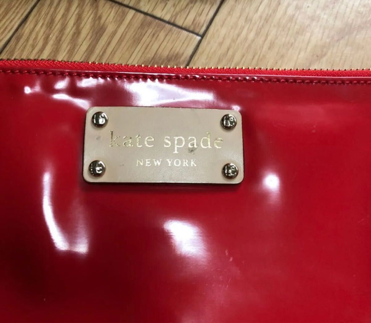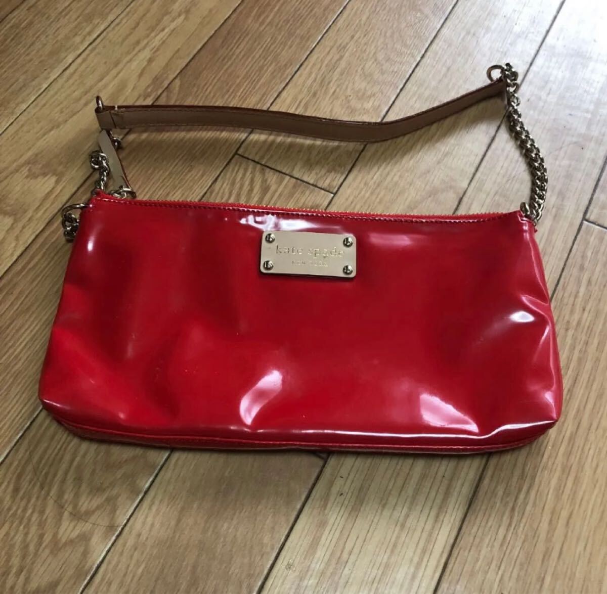 kate spade new yorkのエナメル素材のチェーンバッグです。鮮やかなレッドが特徴で、コーディネートのアクセントになります。