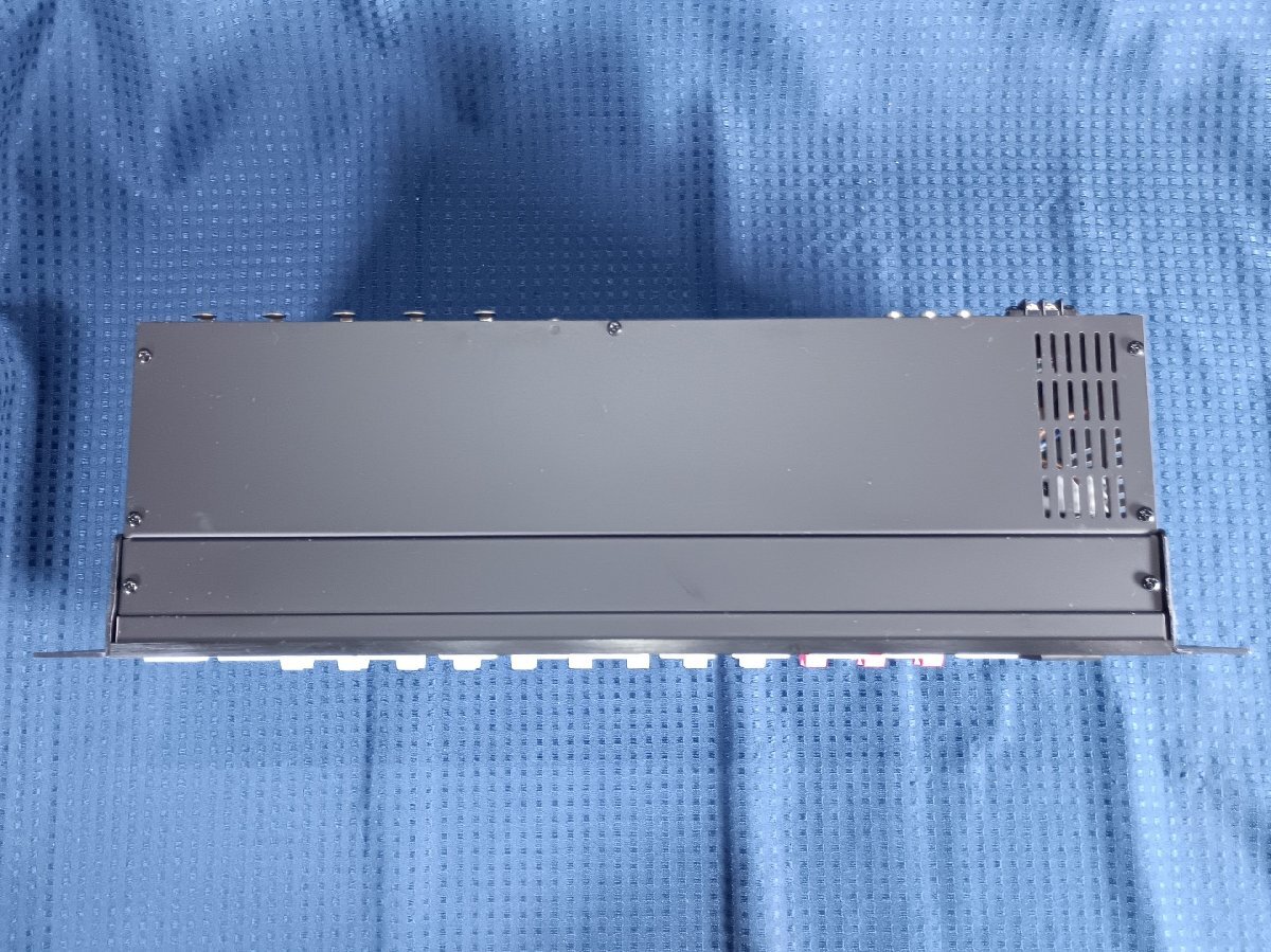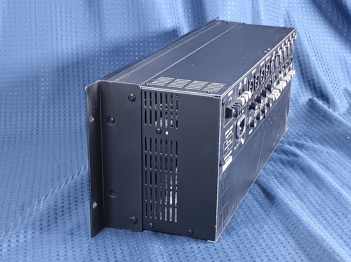 EIA規格に適合するラックに取り付けることができる4サイズのミキサーです。入出力の音量調整は全てスライドフェーダー(100 mm)を採用していますので、操作性や視認性がよくなっています。バスが3系統(モノラル2,ステレオ1)あり、入力ごとに系統を選択できます。モノラル入力にはリミッターを搭載していますので過大な入力にも歪みにくくなっています。リアパネルのコネクター部を上面に移動可能なため、ケーブル接続が背面または、上面からできます。