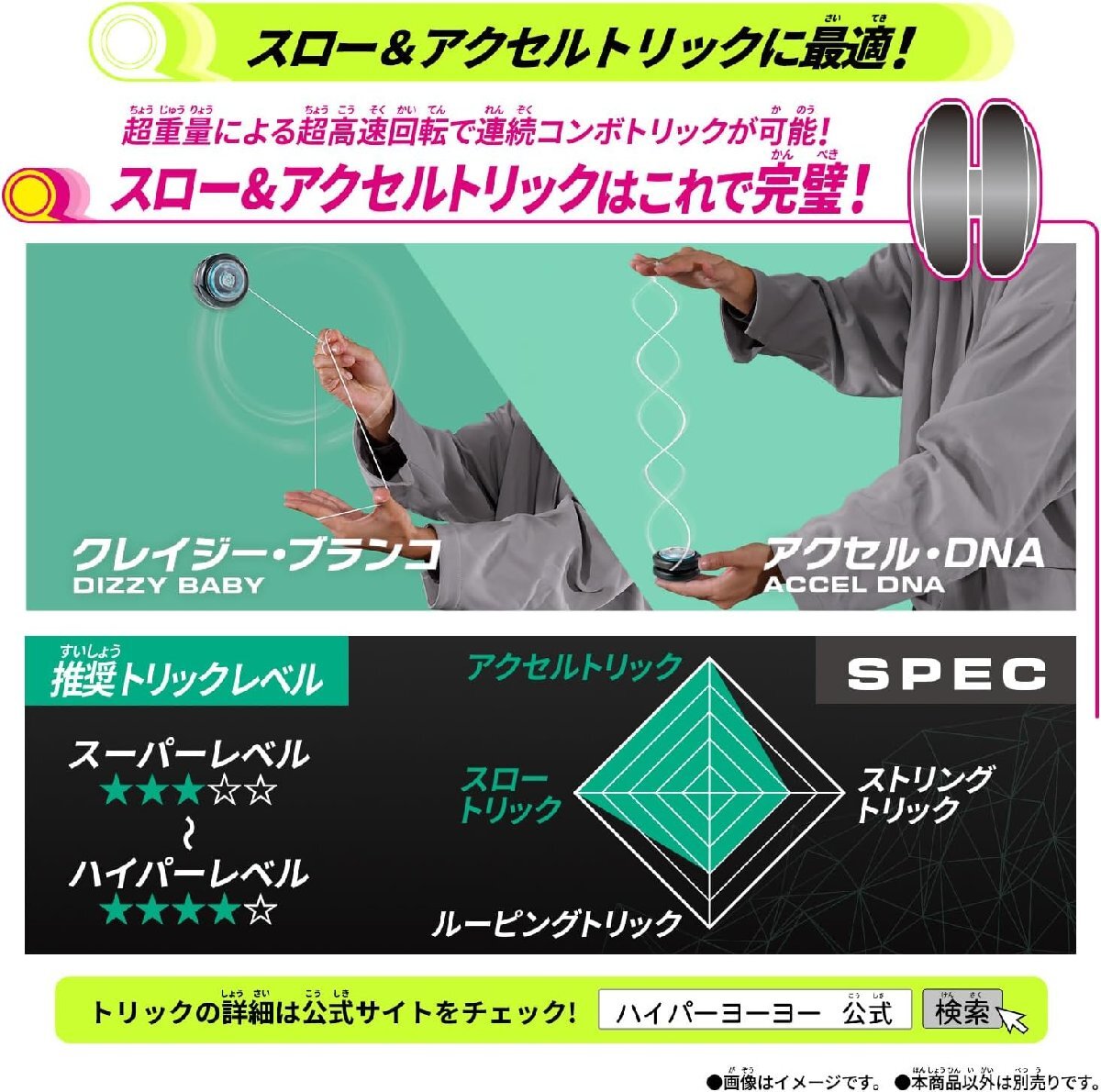 本体を手に持った状態でストリングを勢いよく引くことで、本体を投げずに高速回転させることができる日米で特許出願済の新機能「アクセルシステム」を搭載したハイパーヨーヨーシリーズです。本機能を搭載したことにより、従来のヨーヨーでは再現不可能な新たなトリックが可能となりました。