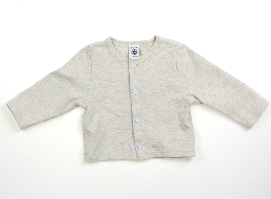 実際のサイズ表記は74cm。衿中心に、黄ばみあり。綿ポリエステル素材。毛羽立ちありますがまだお使いいただけそうです。ボタンはスナップです。