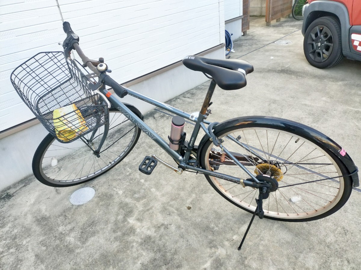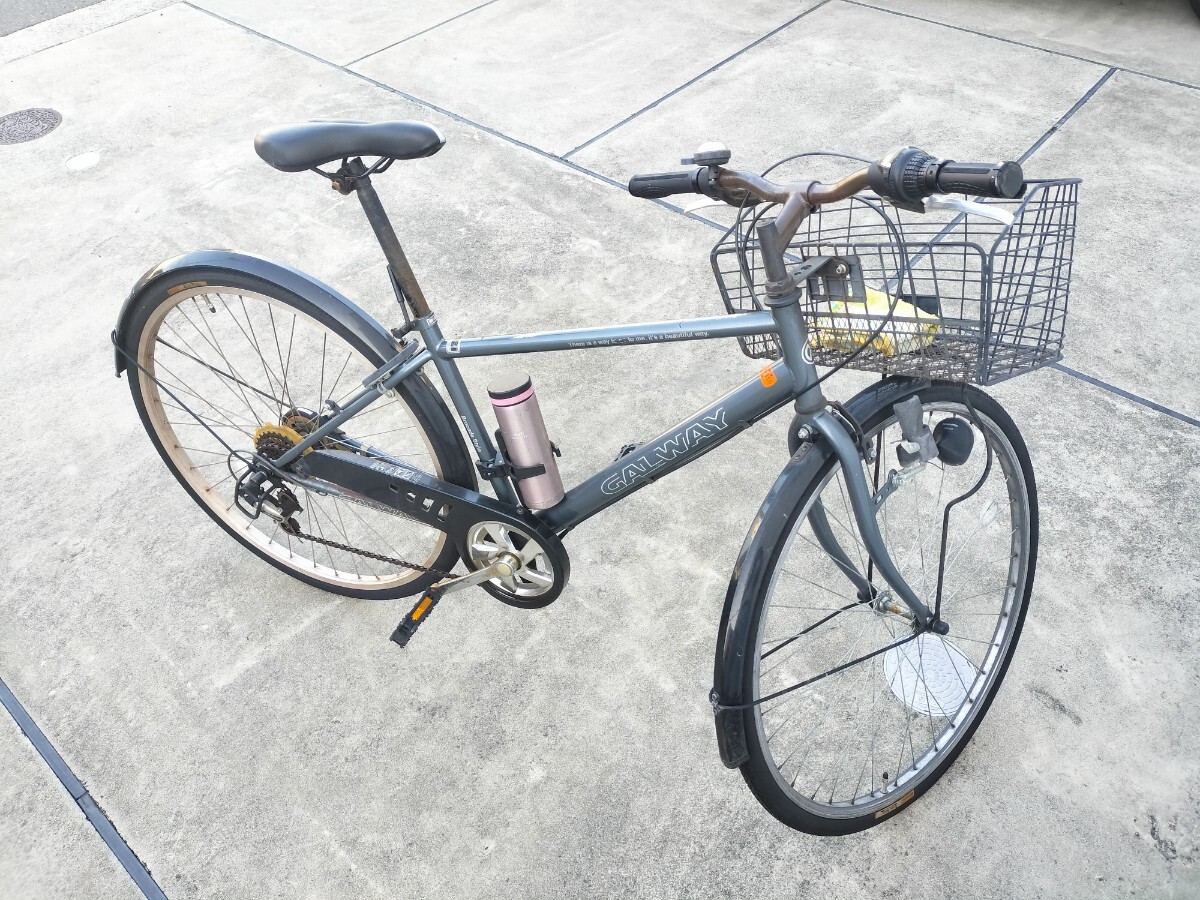 6段ギア付きのグレーのクロスバイク、バスケット付きで便利。