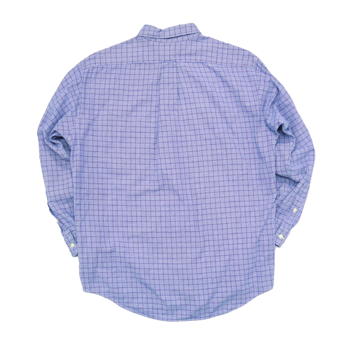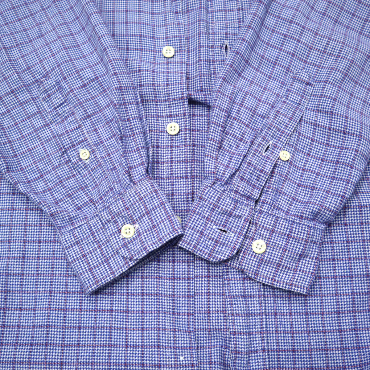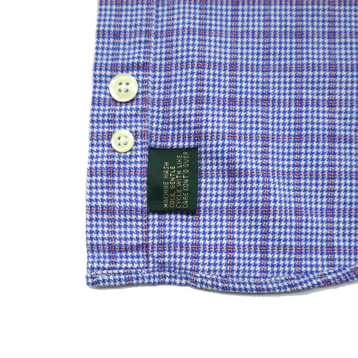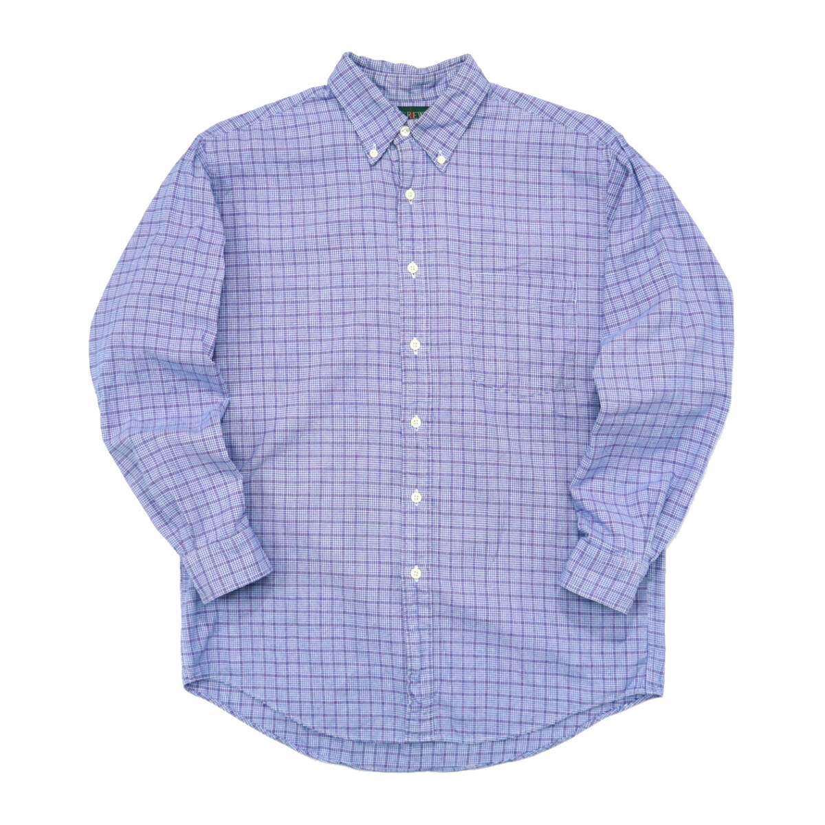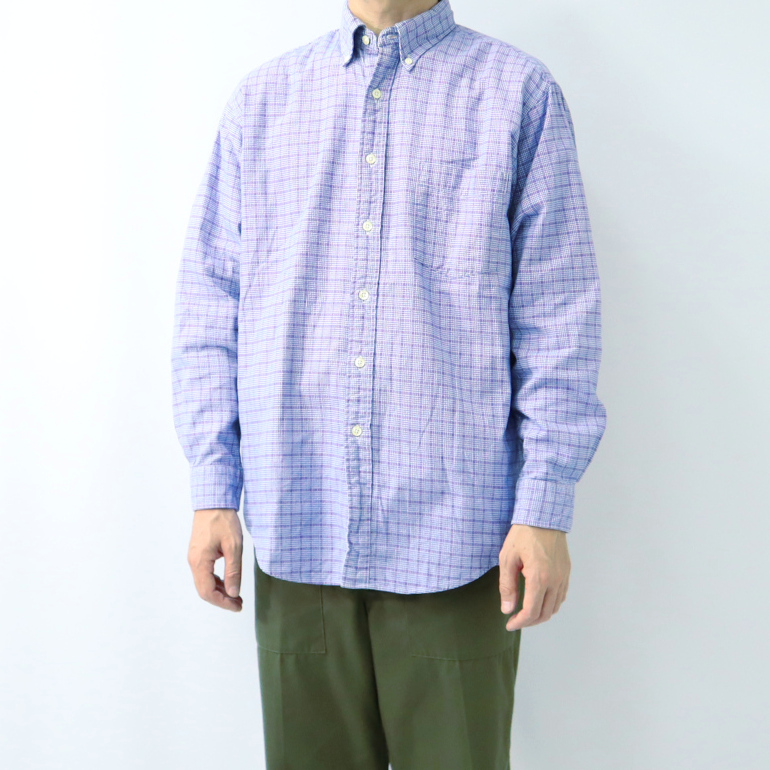 ヴィンテージ ジェイクルーのボタンダウンシャツです。オールドタグの付く、1990年代のアイテムです。素材はコットン、柔らかくソフトな質感で、ネルの様な肌触りですが、ネルシャツ程の起毛は感じられません。白と紺が千鳥格子の様にベースとなり、赤の格子ラインが入る事で、青紫の様な色に感じます。オールドジェイクルーも良いアイテムが多いです。アメリカで見つけた一点物、宜しくお願い致します。