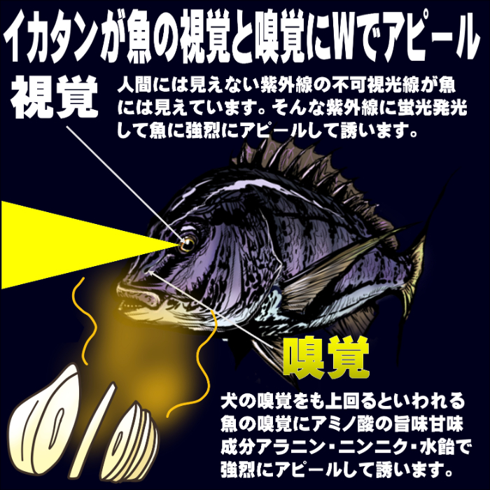 ケイムラホワイトイカタンにはアミノ酸 旨味・甘味成分アラニンと激臭ニンニク、水飴を配合。