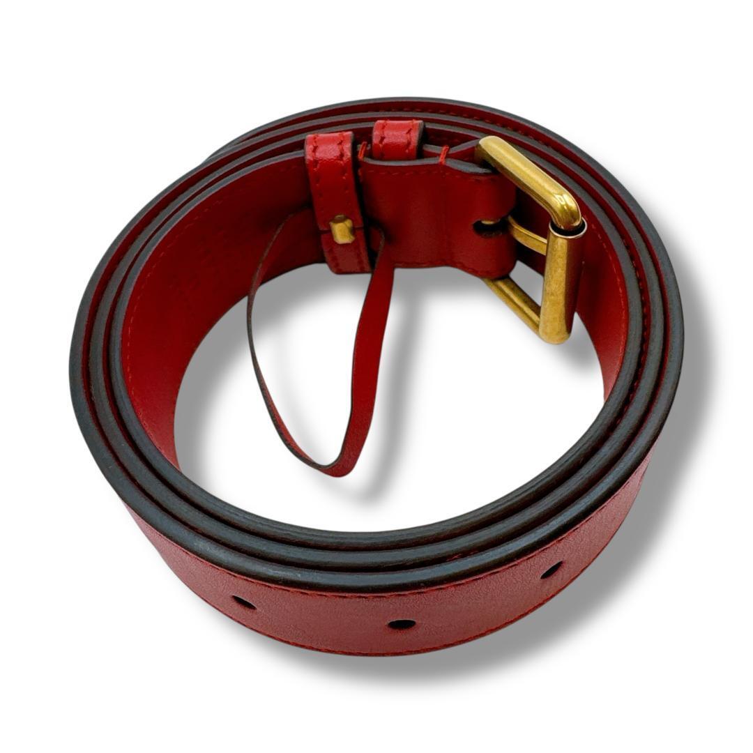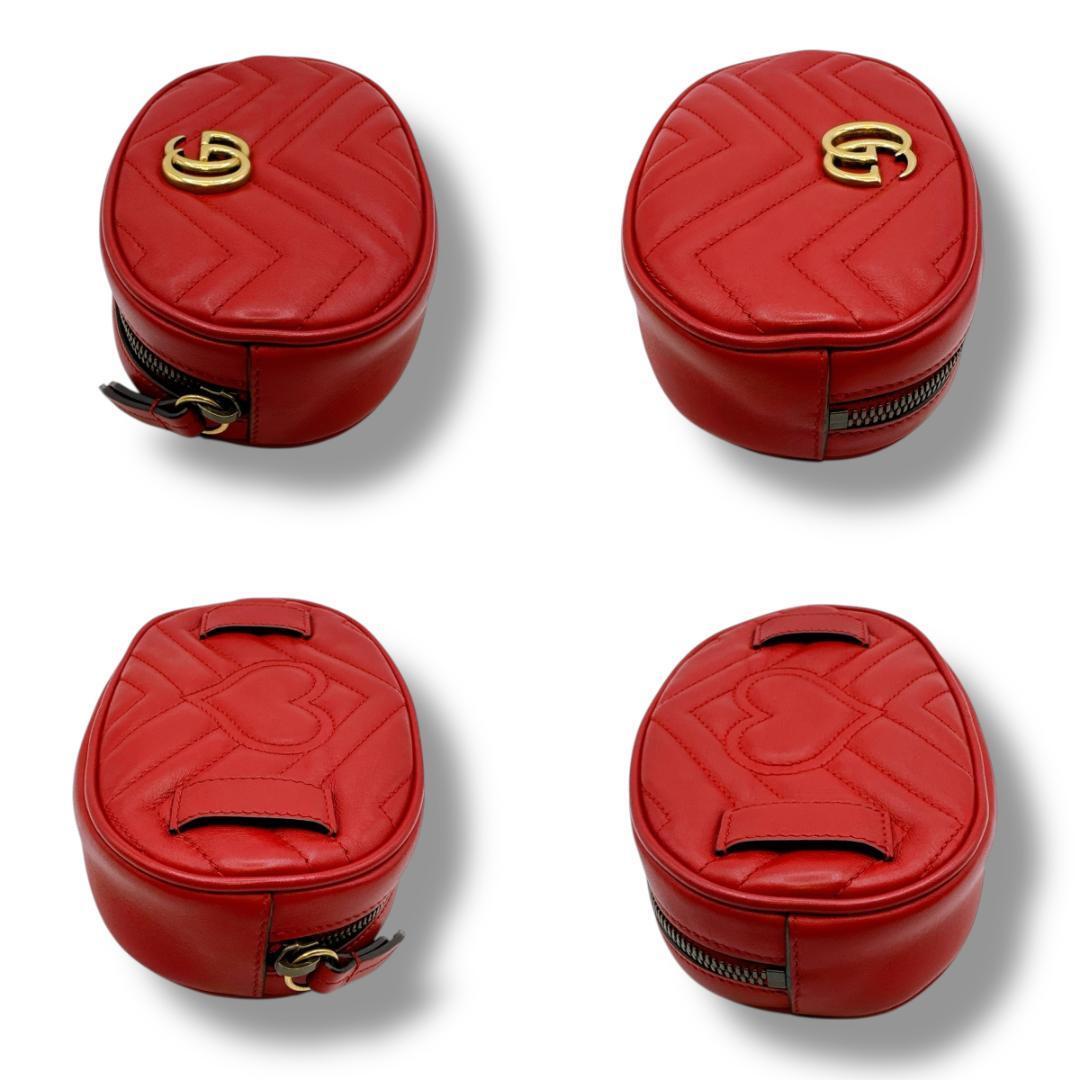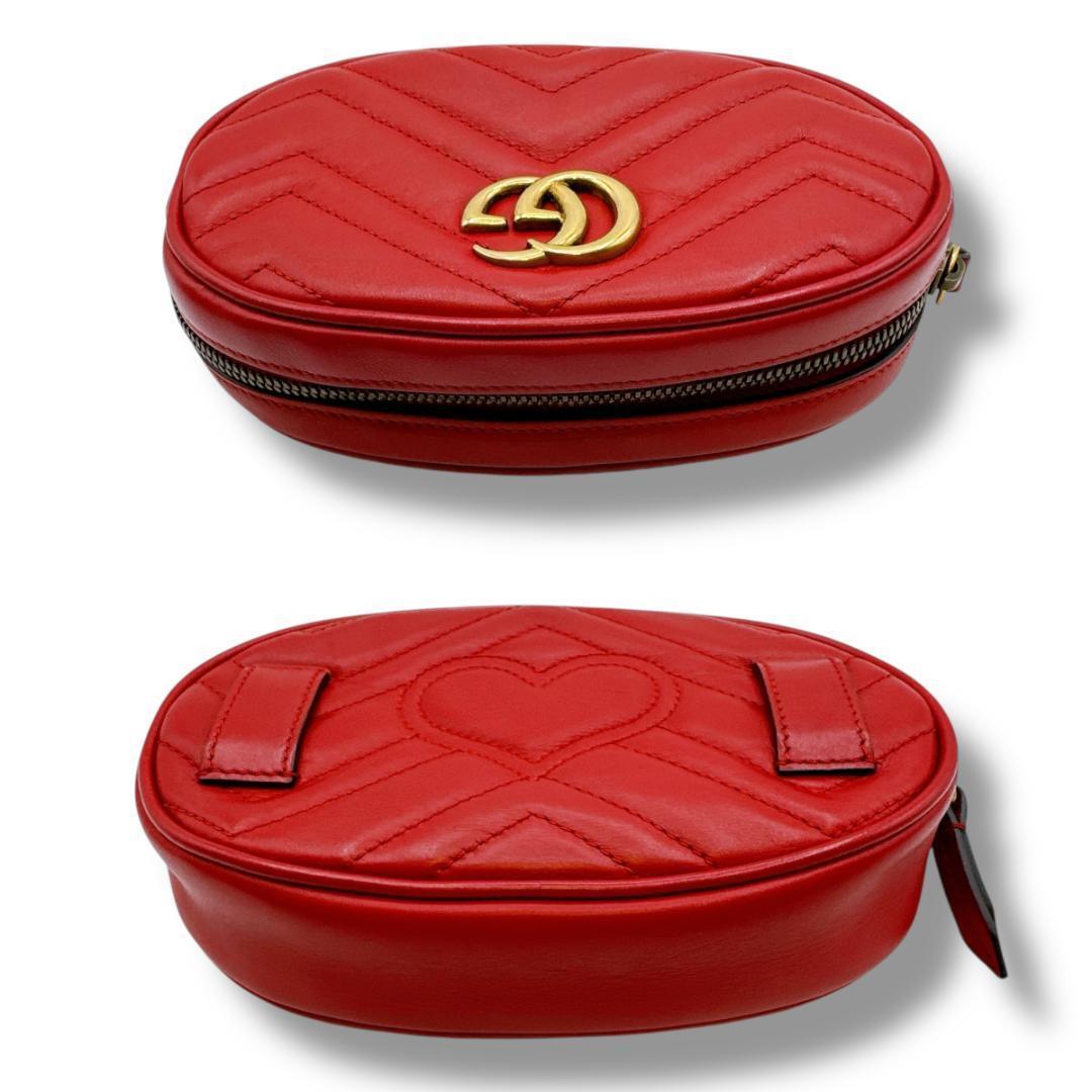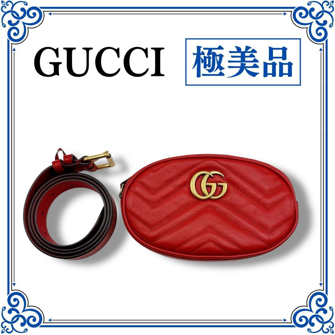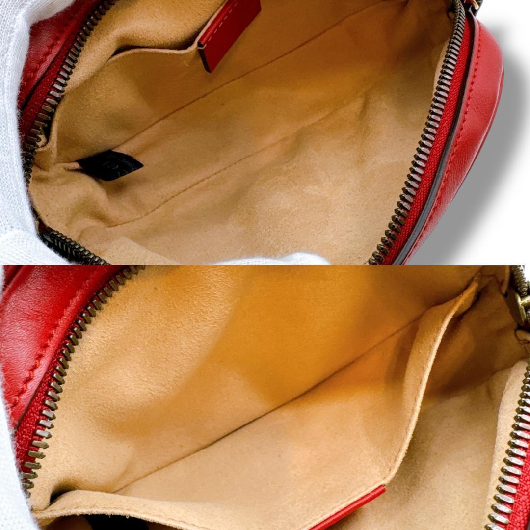 Gucciのボディバッグは、洗練された赤いレザーと特徴的なGGロゴが印象的です。チェーンステッチのディテールが施されており、スタイリッシュな印象を与えます。