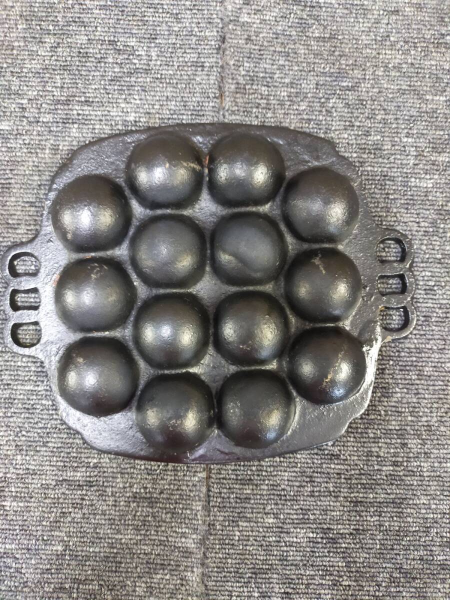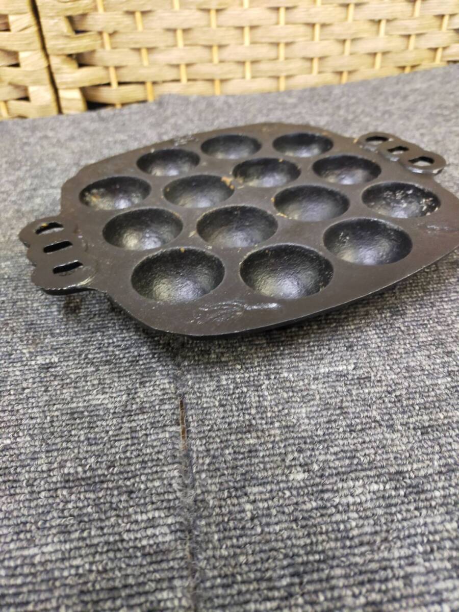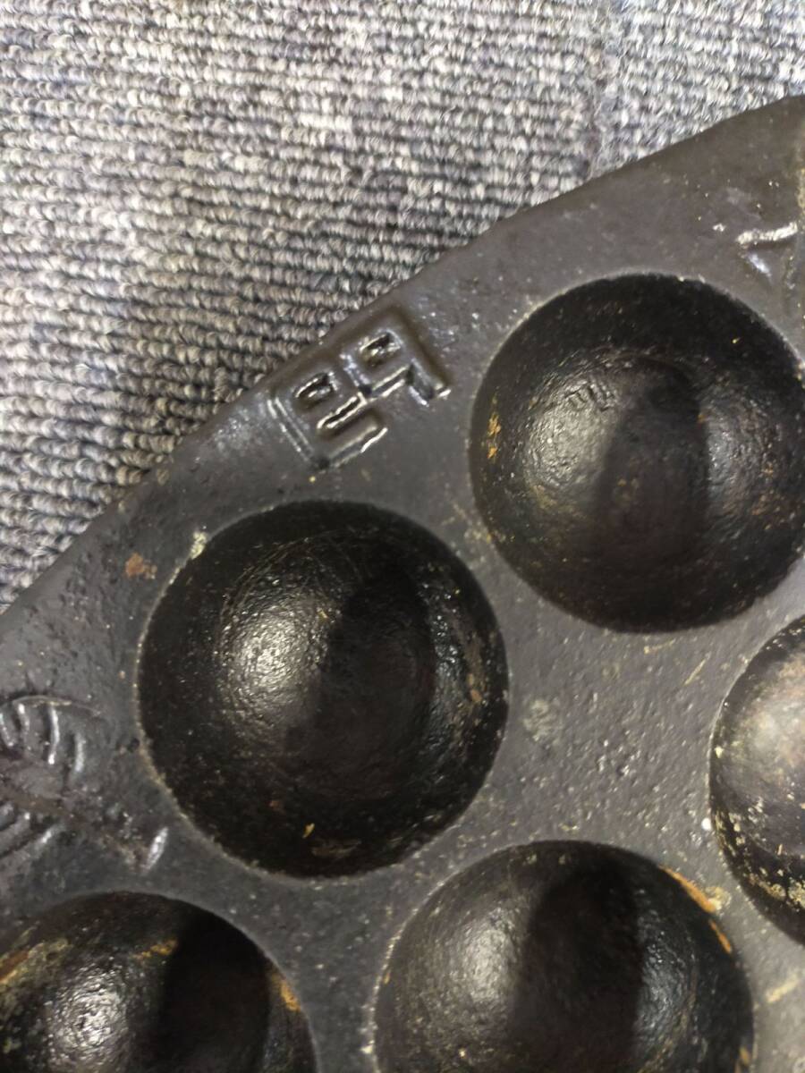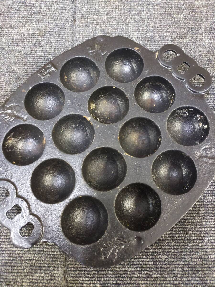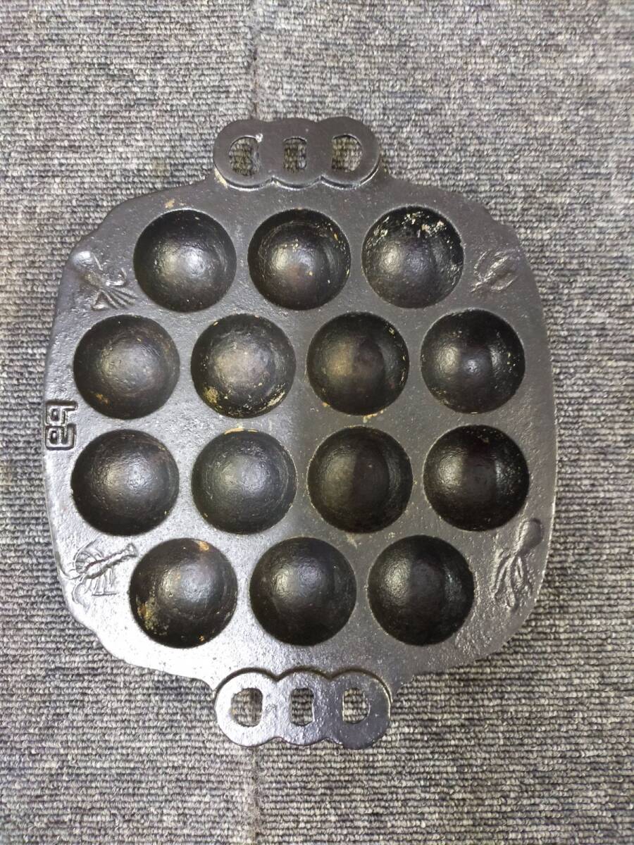 アポロ株式会社製の鋳物製たこ焼き器「タコ焼(大)」です。 しっかりとした鉄製で、外はカリッと中はふわっとした本格的なたこ焼きが楽しめます。 【商品情報】 ・メーカー:アポロ株式会社 ・材質:鋳鉄(鉄製) ・穴数:14穴、大玉タイプ ・付属品:当時の箱(ダメージあり) 【状態】 ・使用に伴う焦げ跡や多少の汚れあり ・シーズニングをすれば問題なく使用可能 昭和レトロな調理器具をお探しの方や、コレクションにもおすすめです。