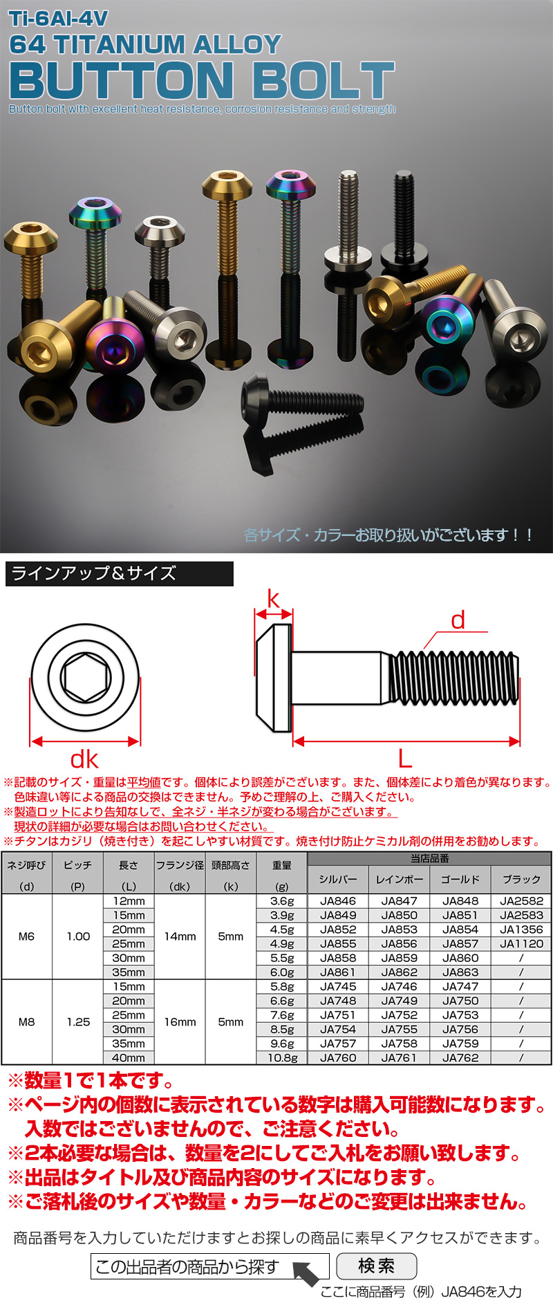 軽量・高剛性な64チタン合金製の六角穴付きボタンボルト。 デザイン性も高く、ドレスアップ要素も兼ね備えた カスタムスクリュー。 外装パーツの取り付けやワンポイントにお勧めです。 カラーバリエーション豊富で、お洒落にカスタマイズ出来ます。 ■他のサイズやカラーは⇒ こちら ■その他、チタン製スクリューは⇒ こちら | ■ テーパーヘッド ボタンボルト ■ 材質:64チタン(Ti6Al-4V) ■ カラー:焼きチタン ■ ネジの呼び:M6 ■ ピッチ:1.00 ■ 長さ:15mm(ネジ部15mm) ■ 入数:数量1で1個 価格は数量1個の価格です。5本必要な場合はご入札時の数量を5に設定してご入札下さい。 ※チタンはカジリ(焼き付き)を起こしやすい材質です。折損防止のため、グリス等のかじり防止ケミカル材のご使用をお勧めします。 | |