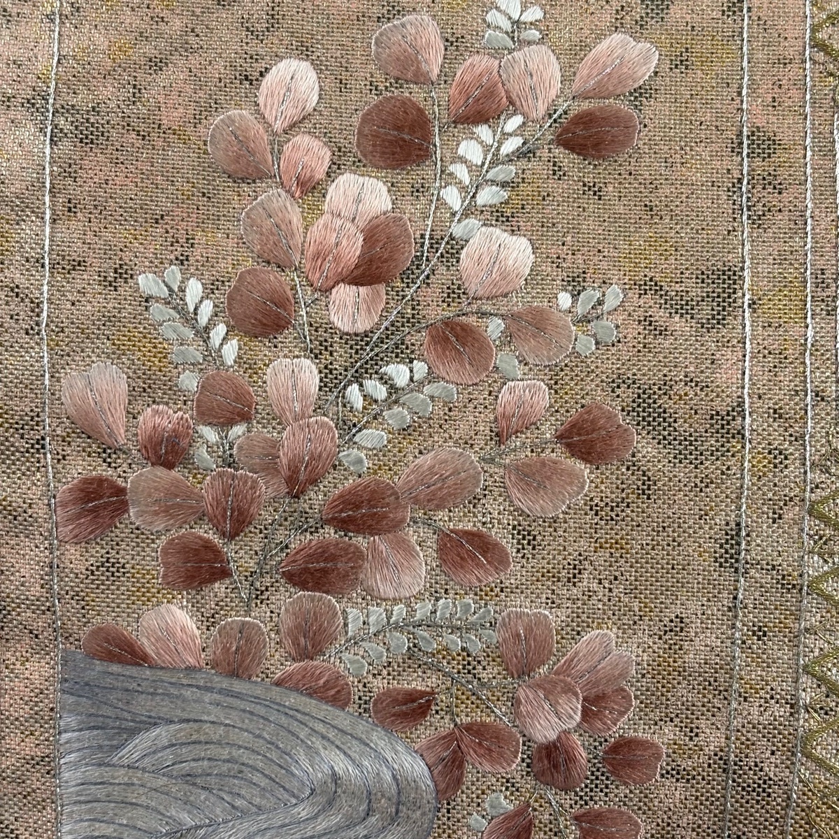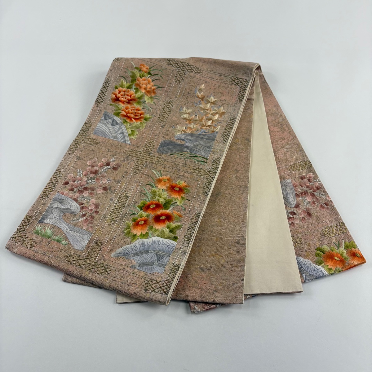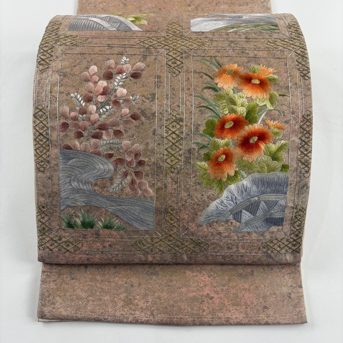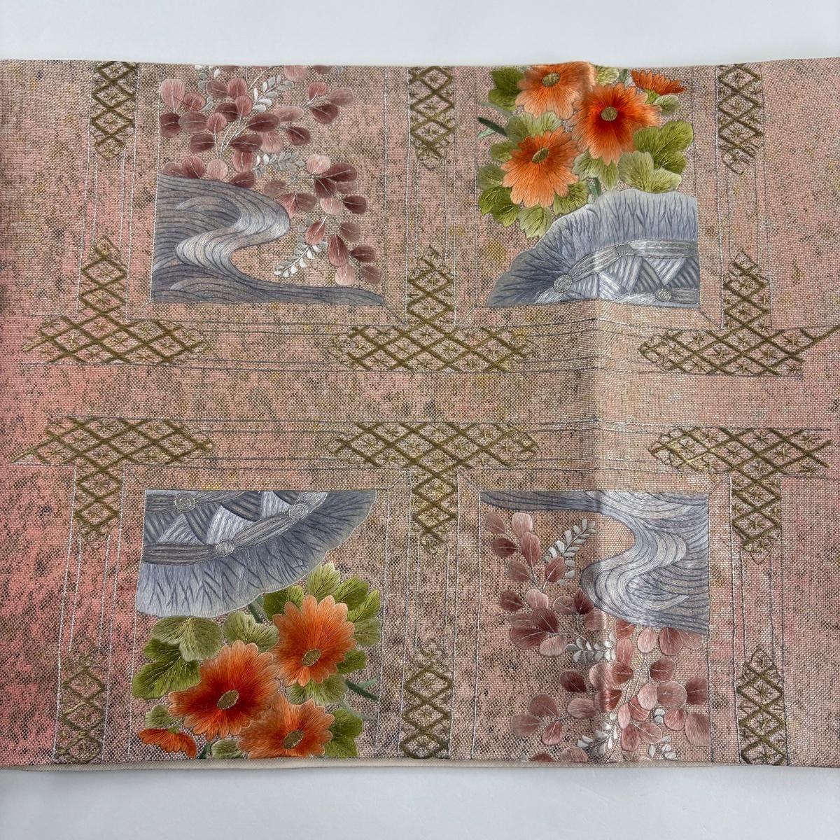 | 袋帯 名品 関西仕立て 草花 流水 金銀糸 刺繍 ピンク お太鼓柄 正絹 【中古】 |