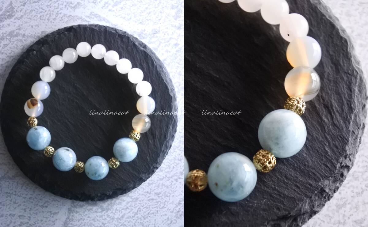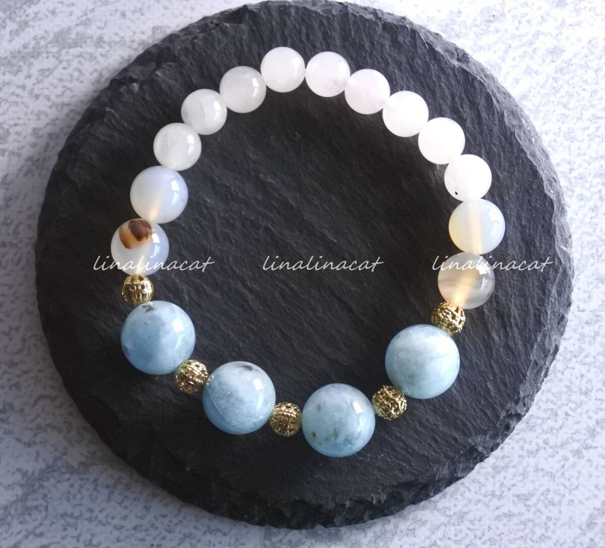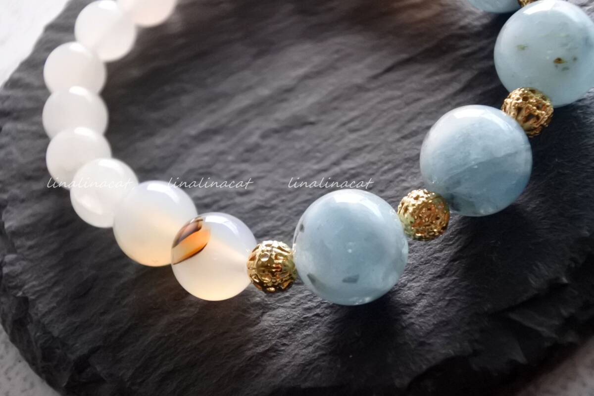 天然石ブレスレット №5 17㎝ アクアマリン、ガーデンクオーツ ローズクオーツ パワーストーン 美しいさざ波を閉じ込めたような綺麗なアクアマリン、ガーデンクォーツとローズクォーツが並ぶぷっくり透明感のあるブレスレットです。 陽射しを浴びて煌めく「海」をイメージさせるような美しい宝石アクアマリンは、3月の誕生石。マリンブルーの輝きが人々の心を惹きつけ、安らぎや清々しさを感じさせてくれる魅力にあふれています。 アクアマリンの原石は、ベリル(緑柱石)。ベリルの中で、グリーンに輝くものがエメラルド、ブルーに輝くものがアクアマリンに分類され、エメラルドとはいわば親戚のような宝石です。石言葉は、勇敢・聡明・幸福・富。海にまつわる神話や言い伝えも多いことから、古代ローマでは「海の力が宿った宝石」として、航海の安全や豊漁を願うお守りとしても用いられていました。 ◇◇◇◇◇◇◇◇◇◇◇◇◇◇◇◇◇◇◇◇◇ ミネラルショーや天然石専門店などで購入したコレクションを多数出品中です。 試着したものもございますが基本的にアクセサリーは身に着けないため未使用のコレクションとなります。 天然石のためインクルージョンやクラック、欠けなどあるものもあるかと思いますが「気の良い子」ばかり集めていましたのでその子の個性と歴史として気に入ってくださった方にお譲りできれば幸いです。 日常のちょっとしたおしゃれに。 ささやかなお守りとして。 お気に入りを見つけられますように。 | ||