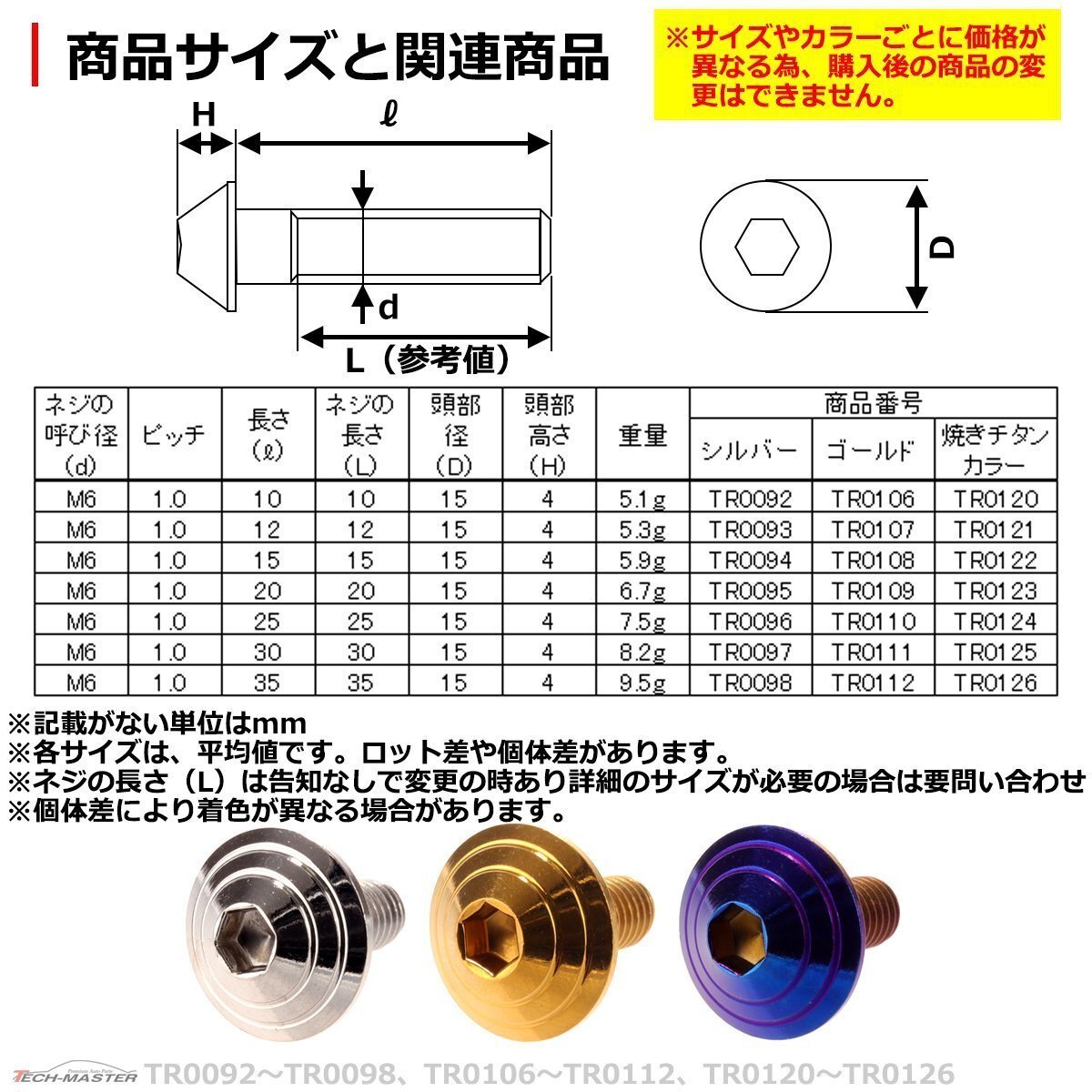 ボタンボルト シェルヘッド 六角穴付きネジ 数量:1個売り 材質:ステンレス 商品サイズ:M6×10mm P1.0(詳細は画像に掲載。各サイズは、参考サイズです。ロット差や個体差があります。) ネジの長さ:10mm(告知なしで変更の時あり、詳細のサイズが必要な場合は要問い合わせ。) 適合車種:汎用タイプ。サイズ等でご判断ください。なお、適合車種に関しての回答は致しておりません。 商品カラー:ゴールド ※サイズやカラーごとに価格が異なる為、購入後の商品の変更はできません。 ※個体差により着色が異なる場合があります。 また、ご購入数しかお取引ができません。 数量以上ご必要の場合は、ご入札前にご質問ください。 在庫がございましたら別途出品させていただきます。 |