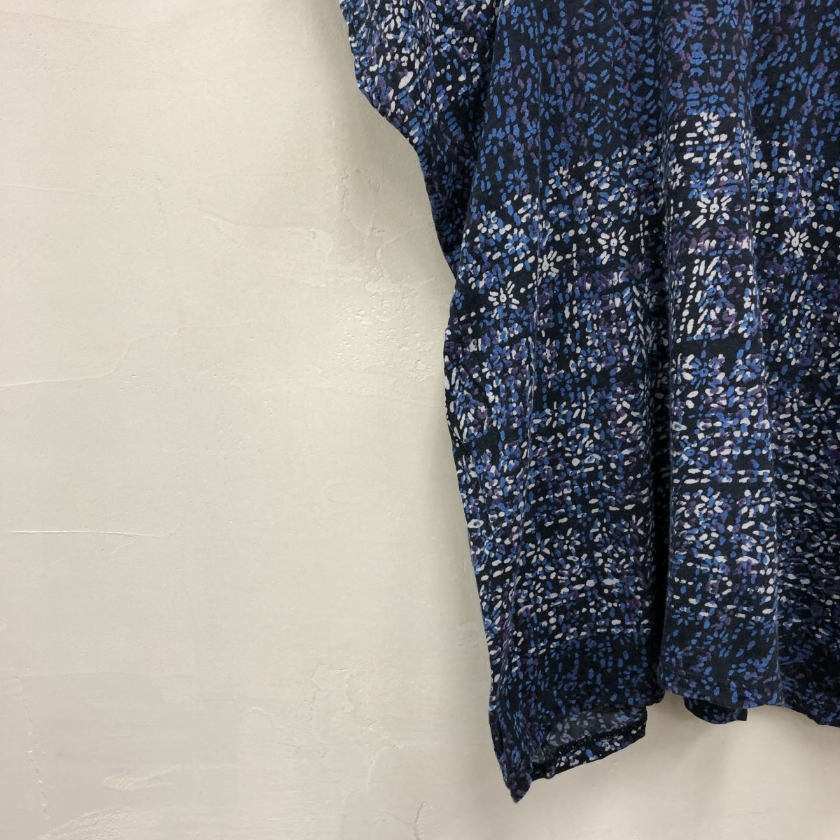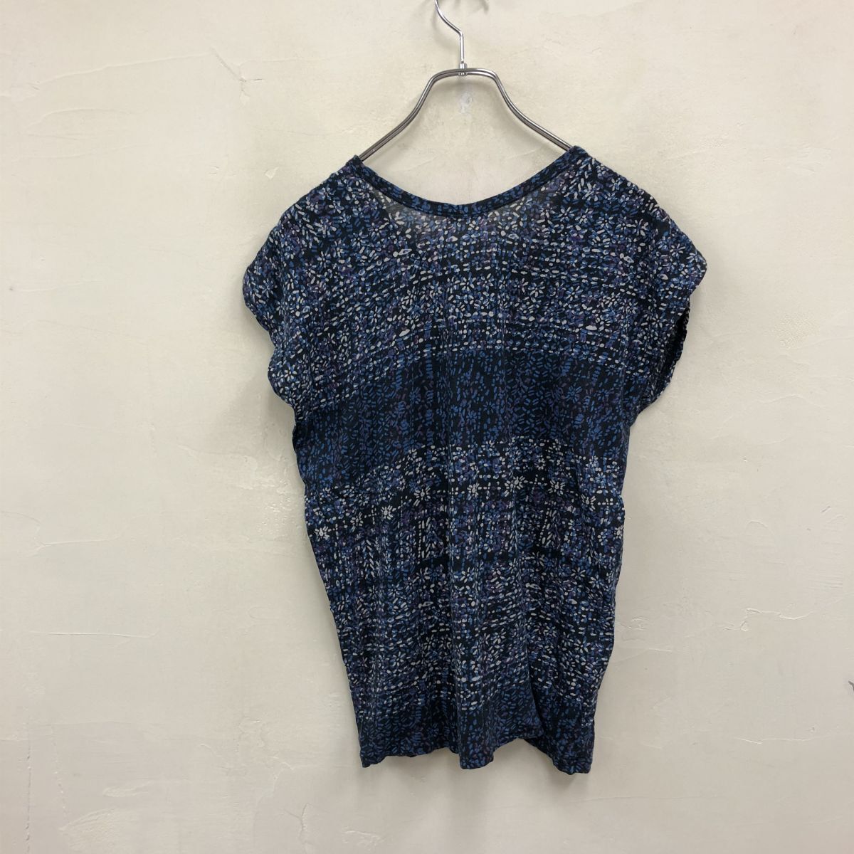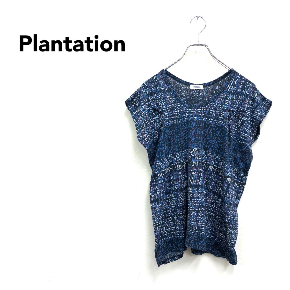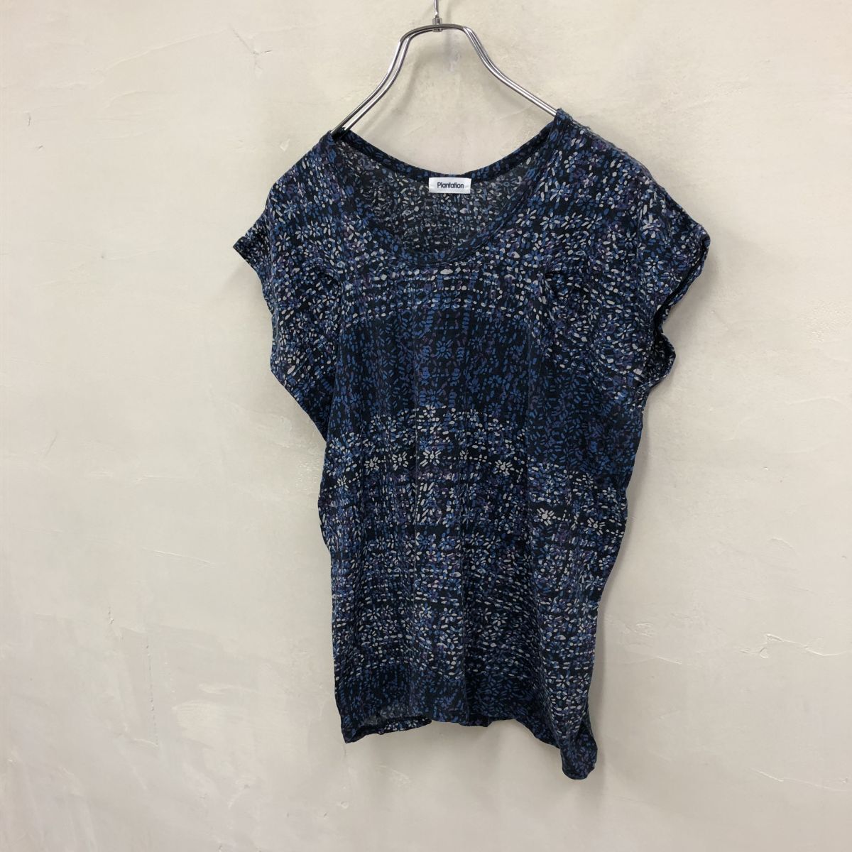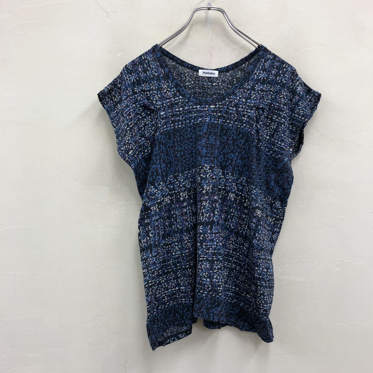 2H2673-G◆ Plantation プランテーションプリントカットソー Tシャツ ノースリーブ Uネック タック ストレッチ ◆ sizeM ネイビー 綿