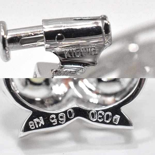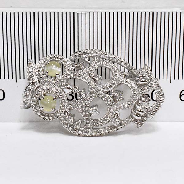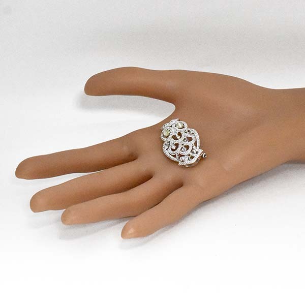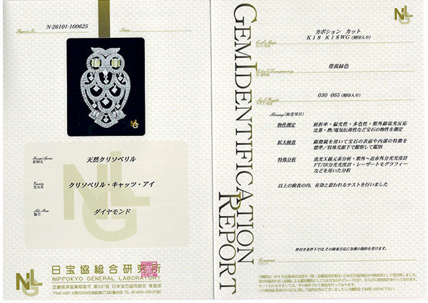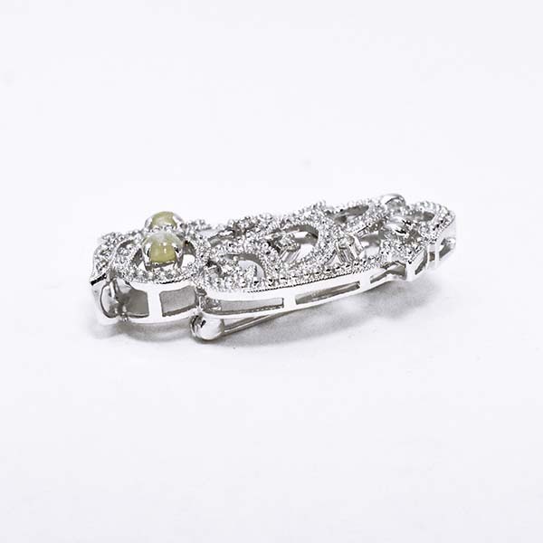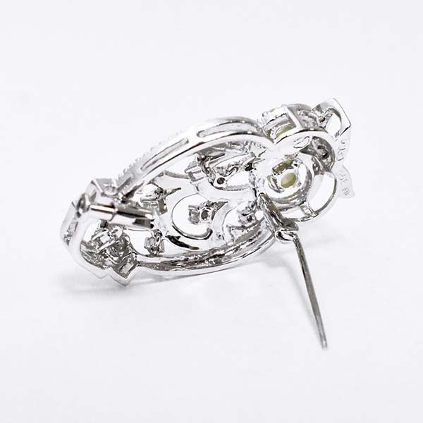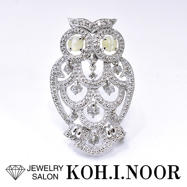 目にキャッツアイがセットされたフクロウモチーフの18金ホワイトゴールド製ペンダント兼ブローチ。
