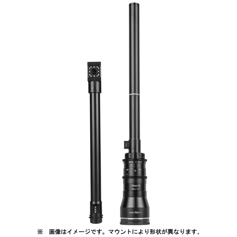 AstrHori アストロリ 18mm F8.0 Macro 2:1 ペリスコープレンズ ダブルレンズセット (スタンダード +90°直角)は、昆虫の視点から世界を捉えるために設計された革新的なマクロレンズです。最大撮影倍率2倍と防水機能を備え、新しい視点での撮影体験をお楽しみいただけます。 外観 レンズ本体はメインユニットとペリスコープの2分割構造を採用し、Φ29mm×460mmとΦ23mm × 452mmの2種類の細長い鏡筒が難しいアングルからの撮影も可能にします。絞りリングとフォーカスリングはレンズギアを採用し、動画撮影時にフォローフォーカスを容易にします。 特長 ・マクロ撮影倍率は2倍で、画角は80度です。(ダイレクトモジュールは76度) 仕様