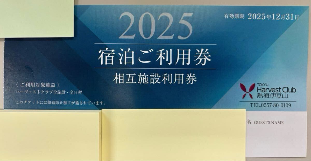 東急ハーヴェストクラブ 熱海伊豆山 相互施設利用券2枚【送料無料】 有効期限・2025/12/31まで有効