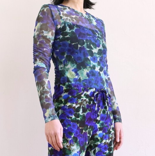 シースルーのストレッチ生地にプリントが施されたシアーカットソー。
