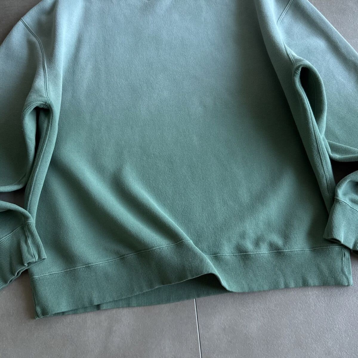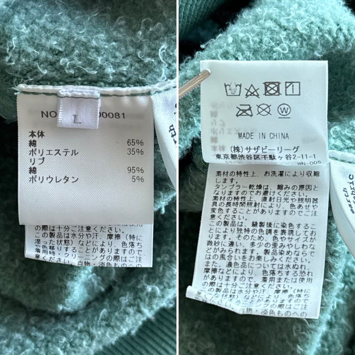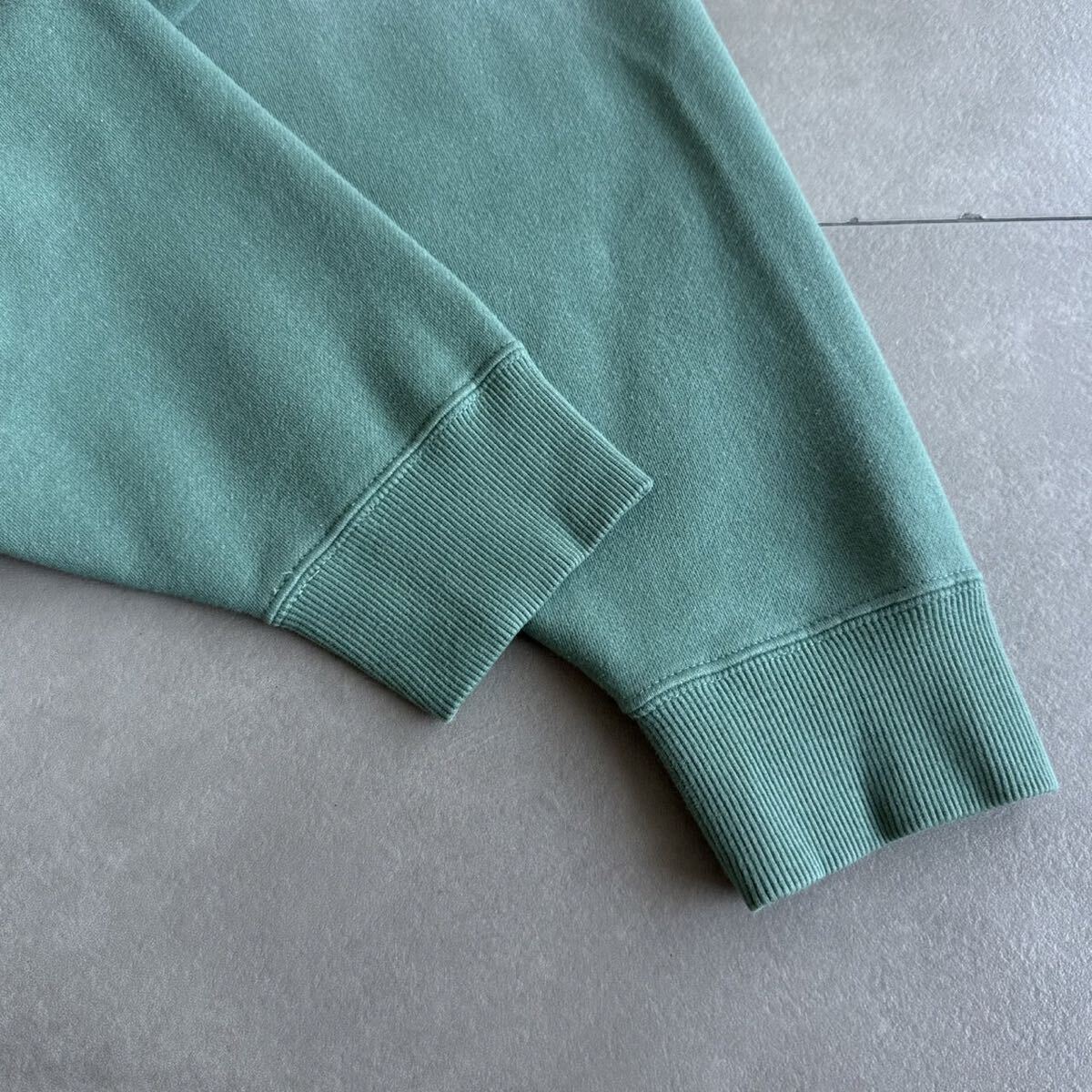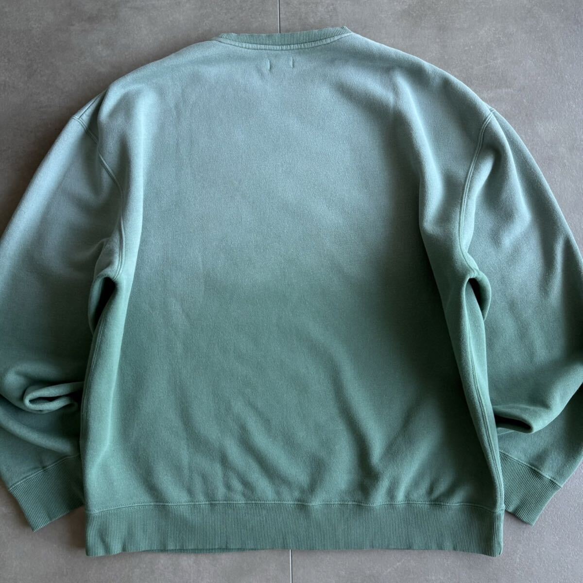 爽やかなグリーンのグラデーションに加え、程よく味わいを感じさせるヴィンテージ加工が施され、まるで長く着込んだような自然な風合いを演出。オーバーサイズシルエットによるゆったりとした着心地は、海辺で潮風にあたりながら過ごすリラックスシーンにぴったりです。