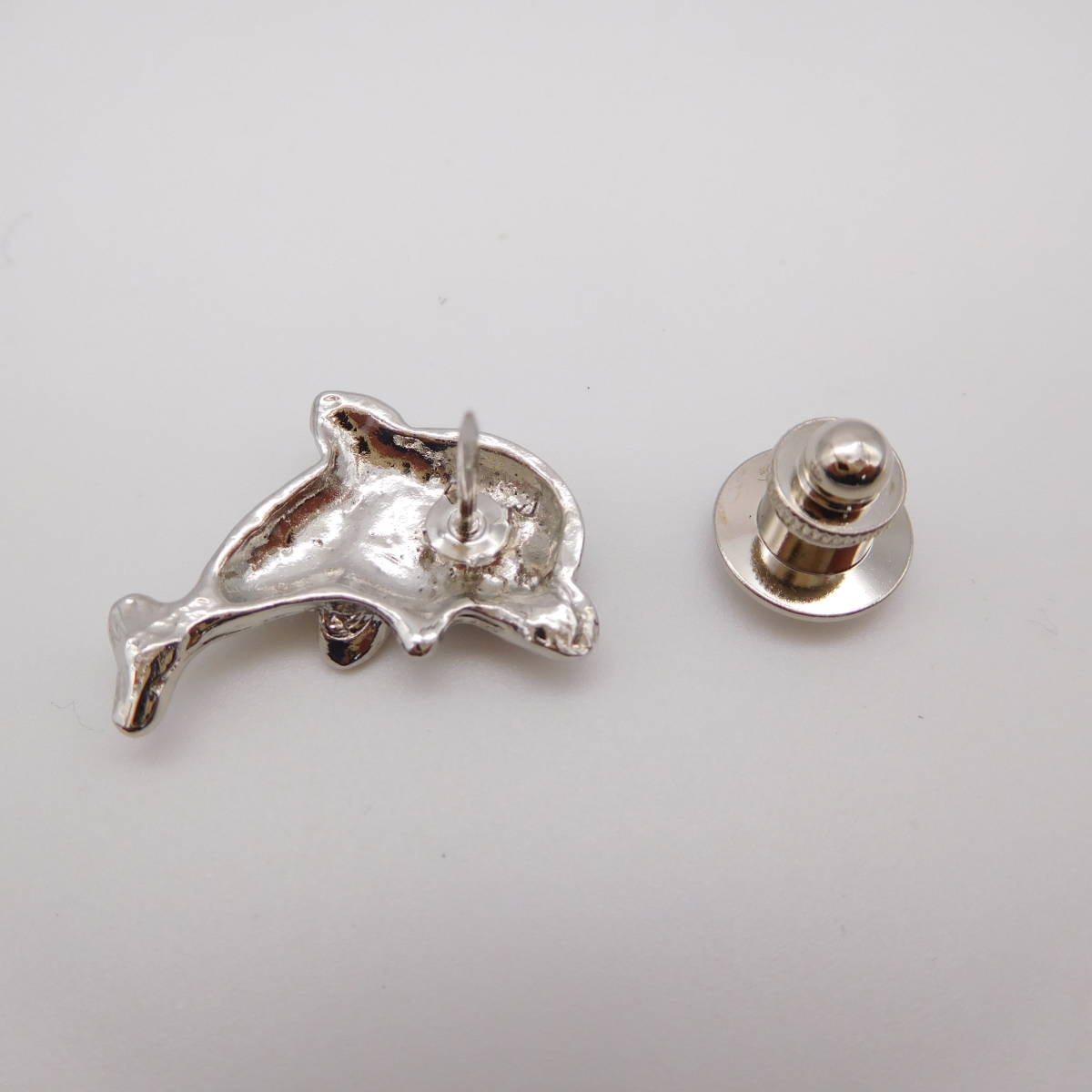 針を布等に刺して留め具に差し込むタイプのドルフィン(イルカ)のピンブローチです。