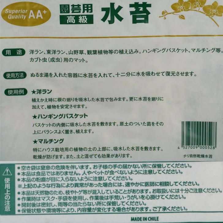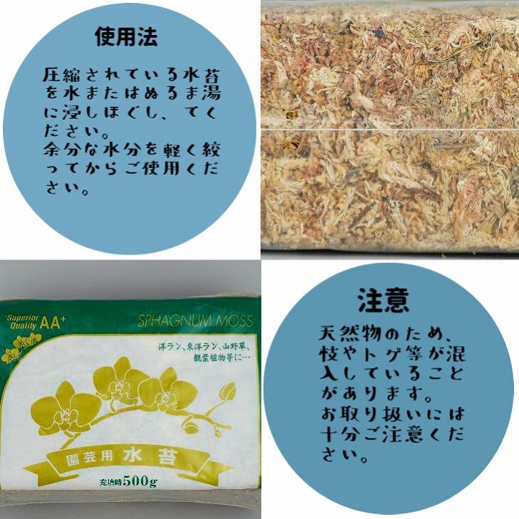 | 使用法 | 圧縮されている水苔を水またはぬるま湯に浸し、ほぐしてください。 余分な水分を軽く絞ってからご使用ください。 |