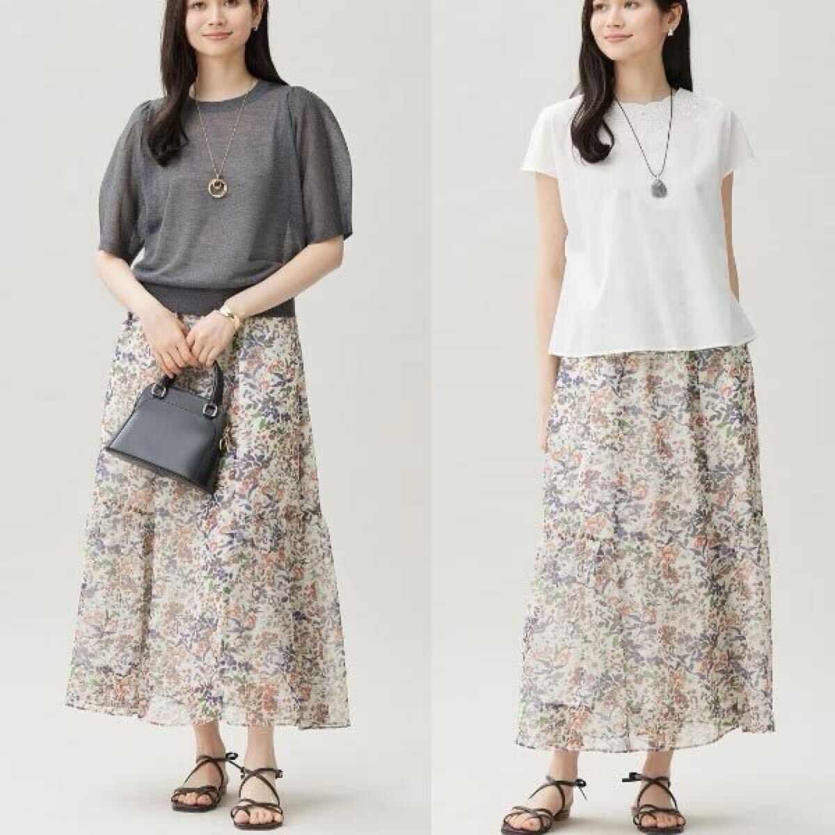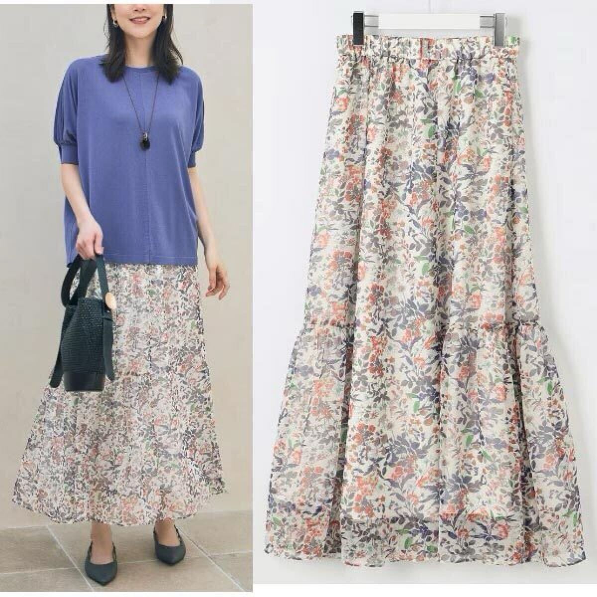 透け感のある素材やギャザーが上品で華やかなボタニカル柄スカート