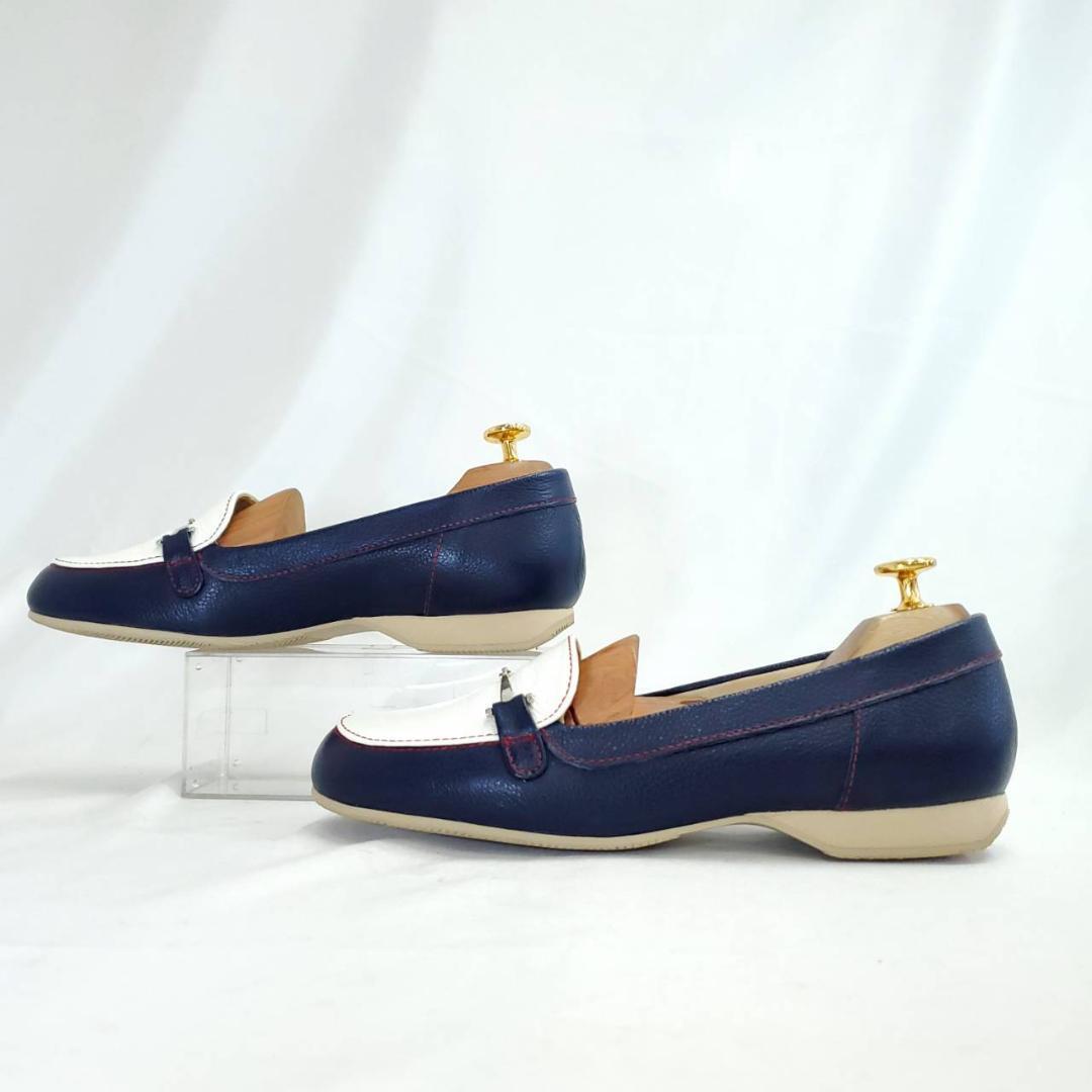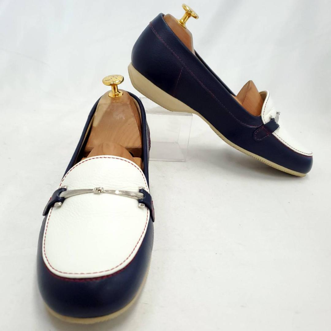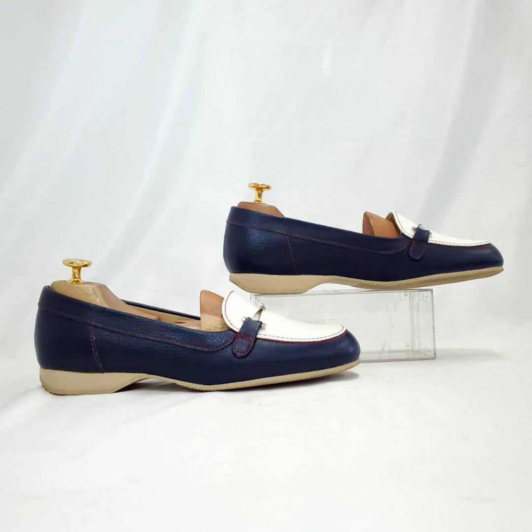 ネイビー×ホワイトの爽やかな配色に、シルバービットがアクセント。フラットすぎず履きやすい、程よいローヒール。