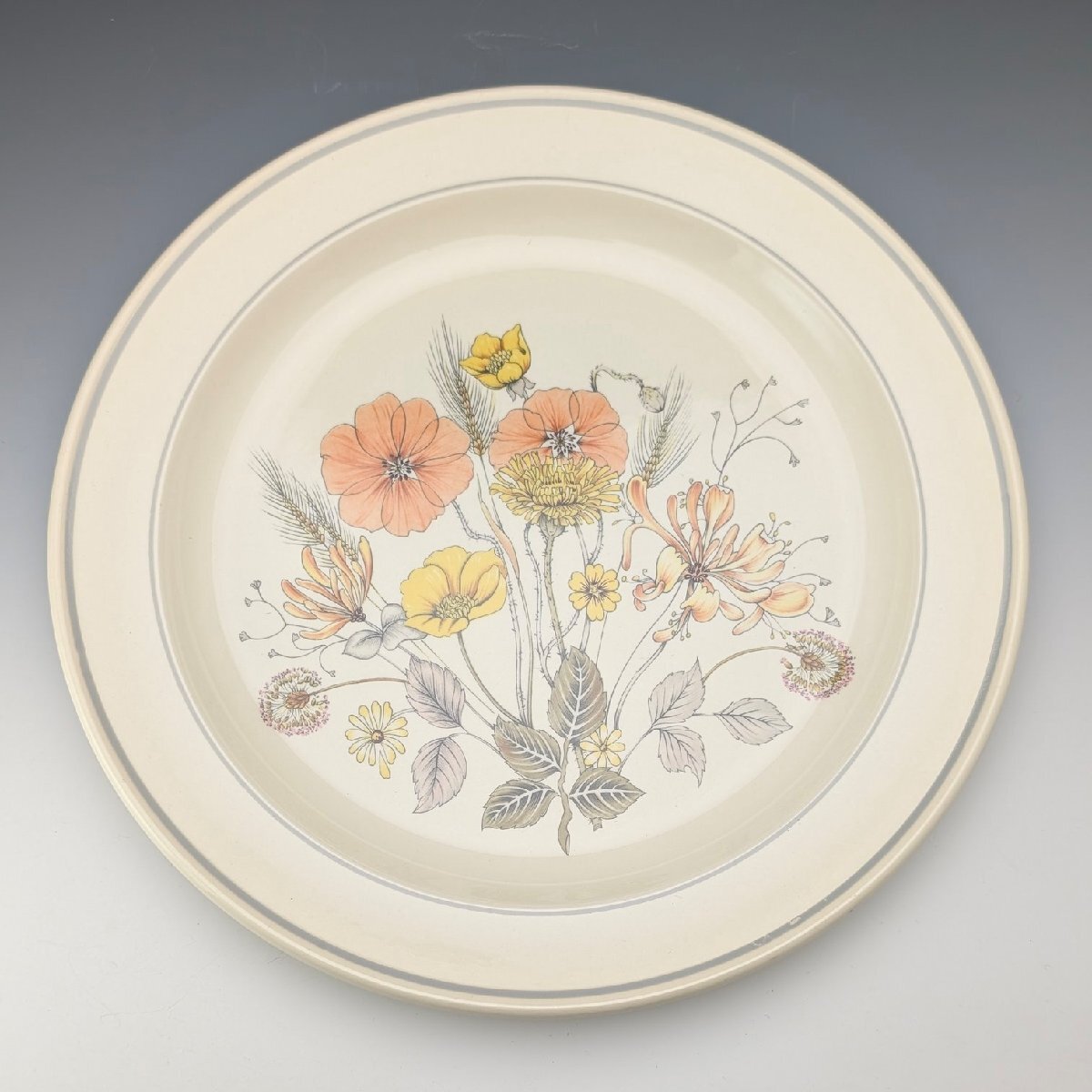やさしいクリーム色の皿に、たんぽぽやひなげしなどの野花が描かれています。