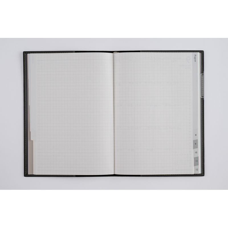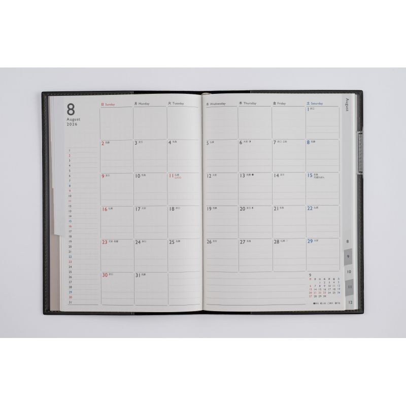 【月間予定表】使いやすいブロック式はインデックス付きで便利。月ごとに横ケイメモと方眼メモが2ページずつ付いているので、月間ページに書ききれなくても安心です。