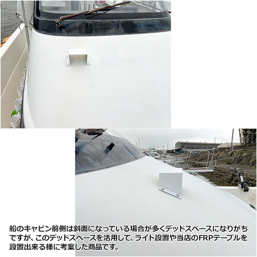船のキャビン前側は斜面になっている場合が多くデッドスペースになりがちですが、このデッドスペースを活用してライト設置や弊社のFRPテーブルを設置出来る様に考案した商品です。