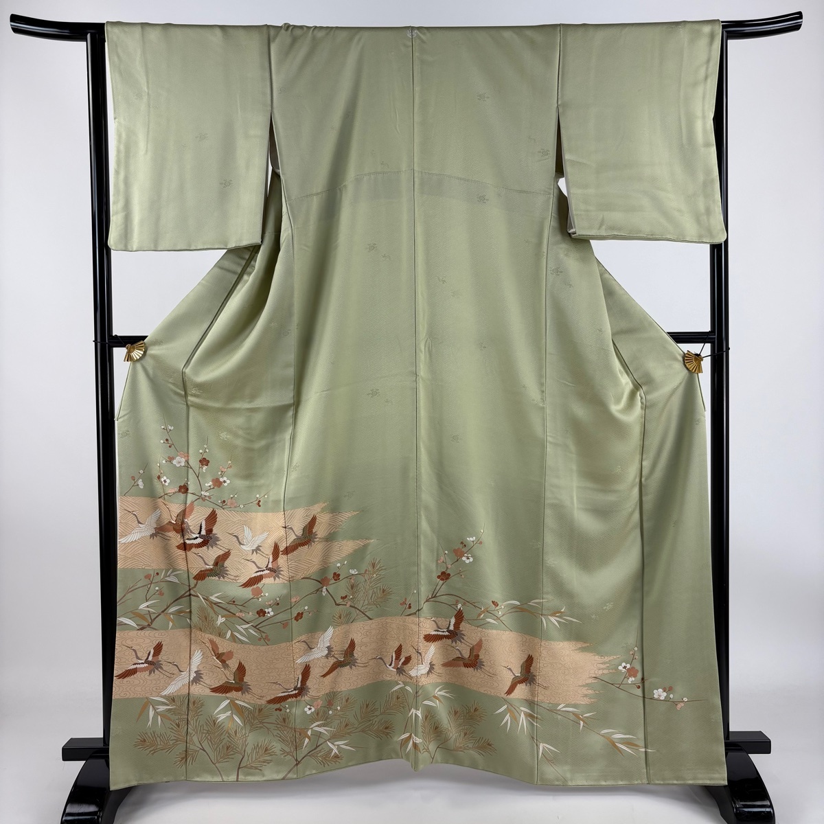 | 色留袖 秀品 鶴 枝梅 刺繍 金彩 灰緑 袷 身丈162 裄丈65 M 正絹 【中古】 |