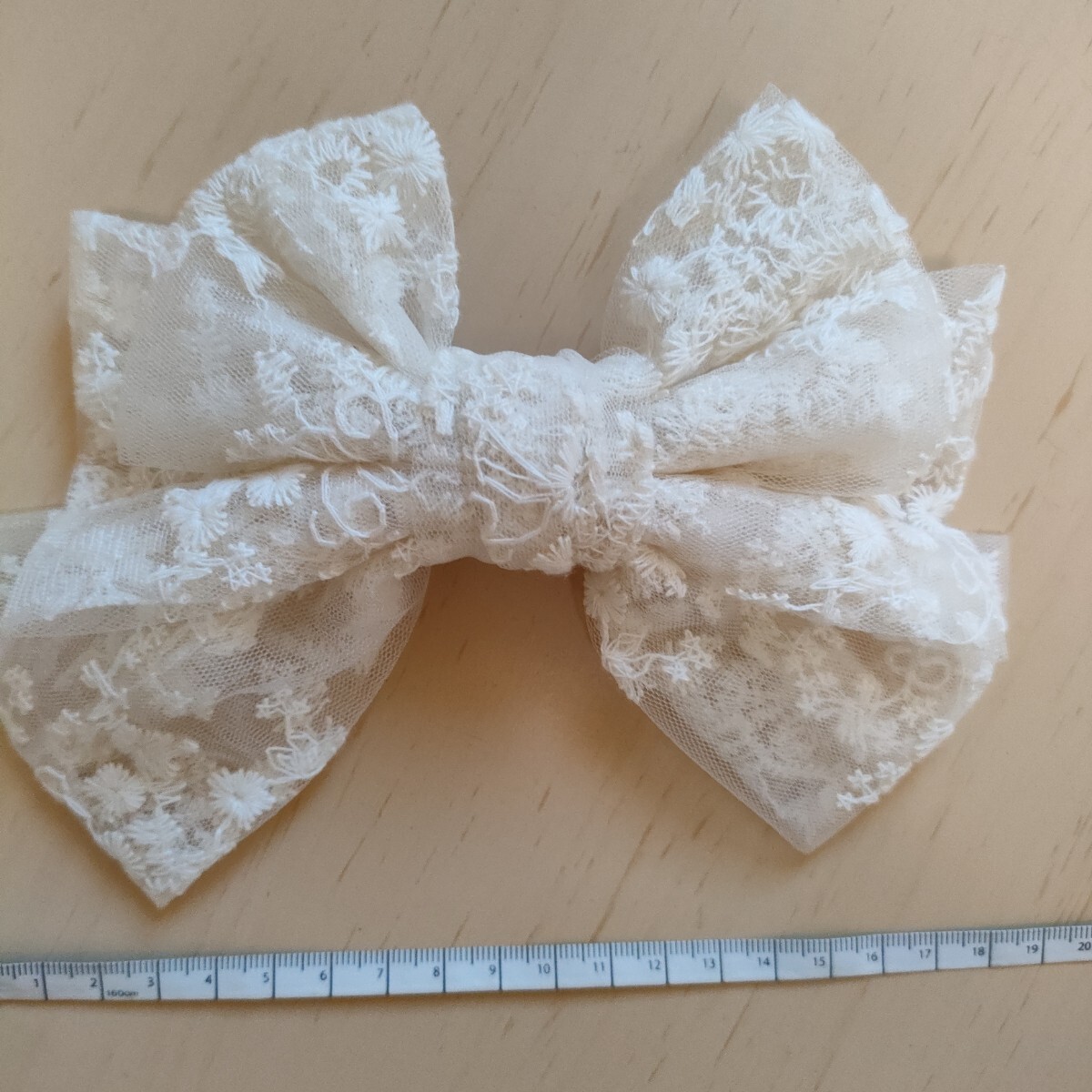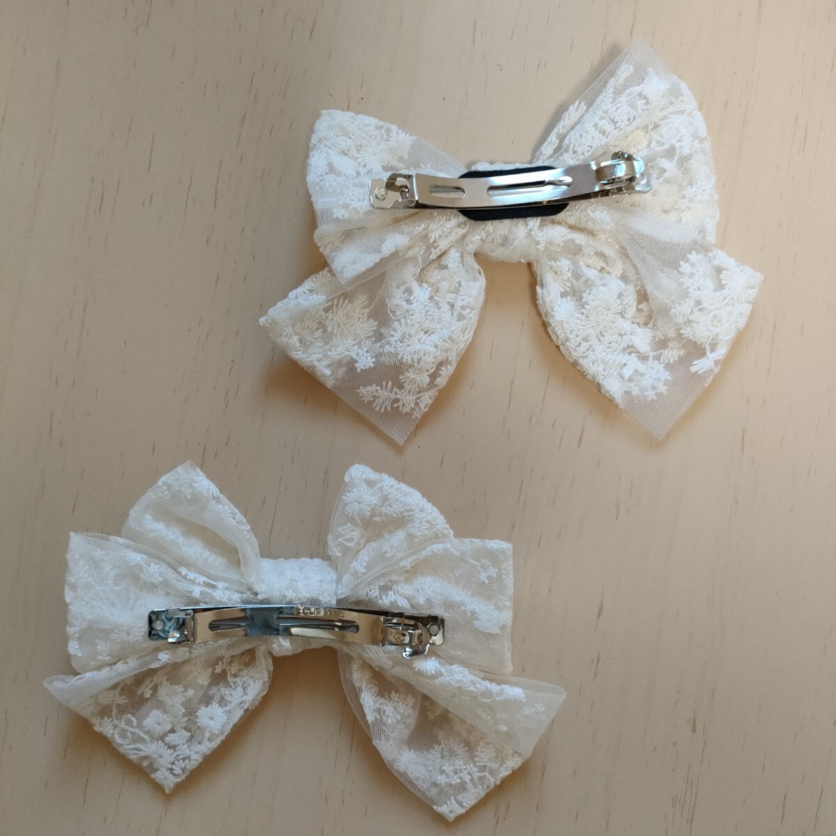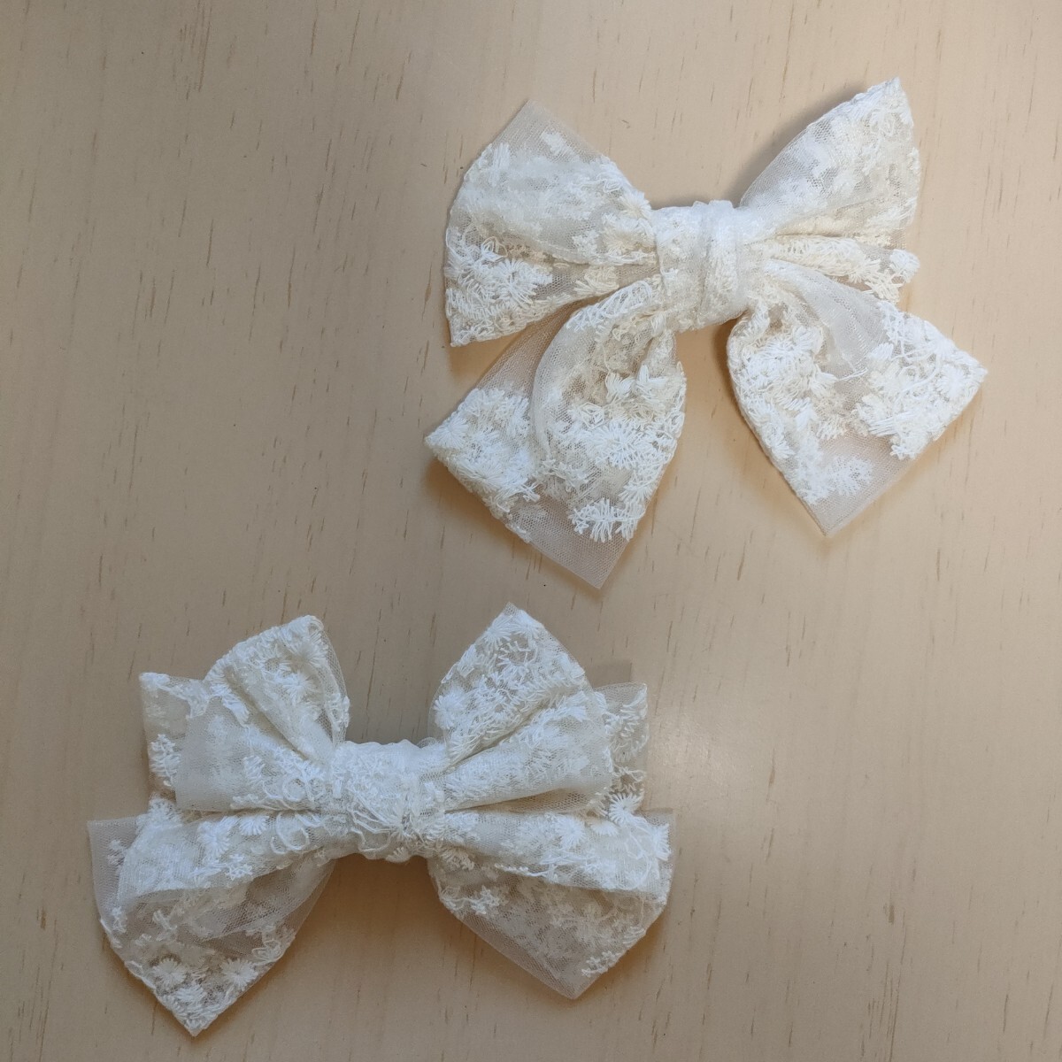 アイボリーのレースリボン2個セット、クリップ式で使いやすい。