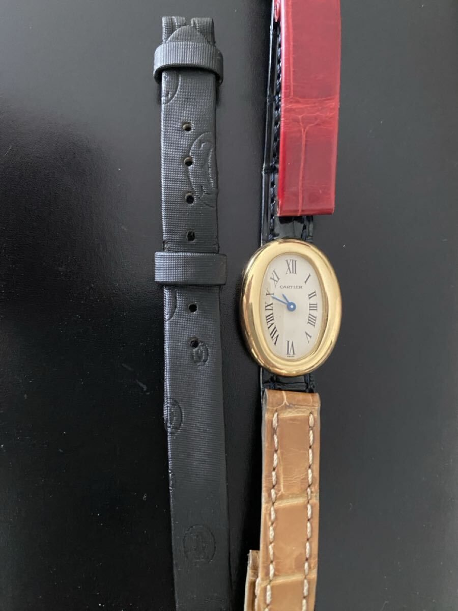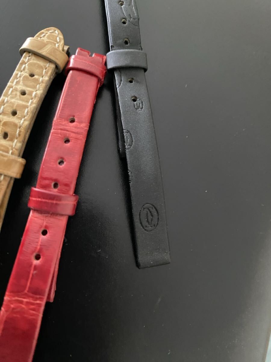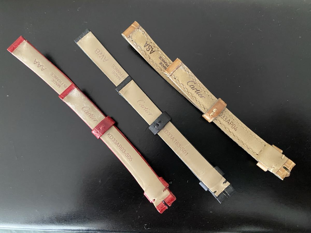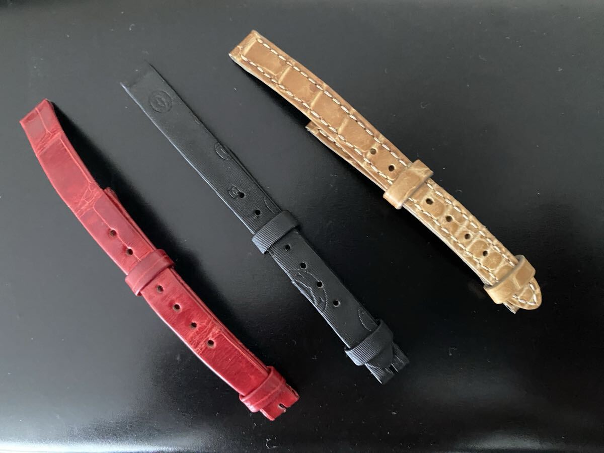 カルティエのミニベニュワール用に何本か9ミリのベルトを持っていますが、あまり使わない色を出品します。使用しておりましたので、ある程度の使用感はございますが、まだまだ使えます。クロコダイルだけでなく、黒色のものは今では作られていないカルティエのマークの入った布張りのものです。マットで和装にも合わせやすい貴重なベルトだと思います。また、赤色なものはアリゲータかと思います。