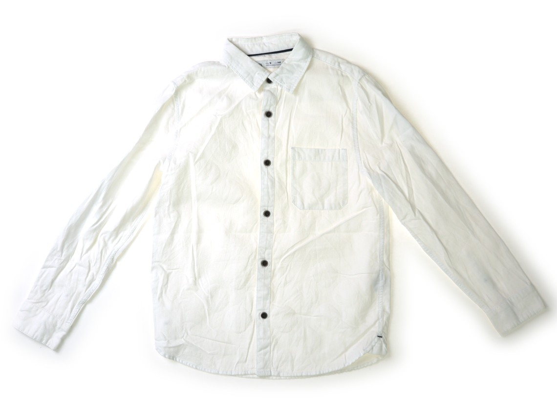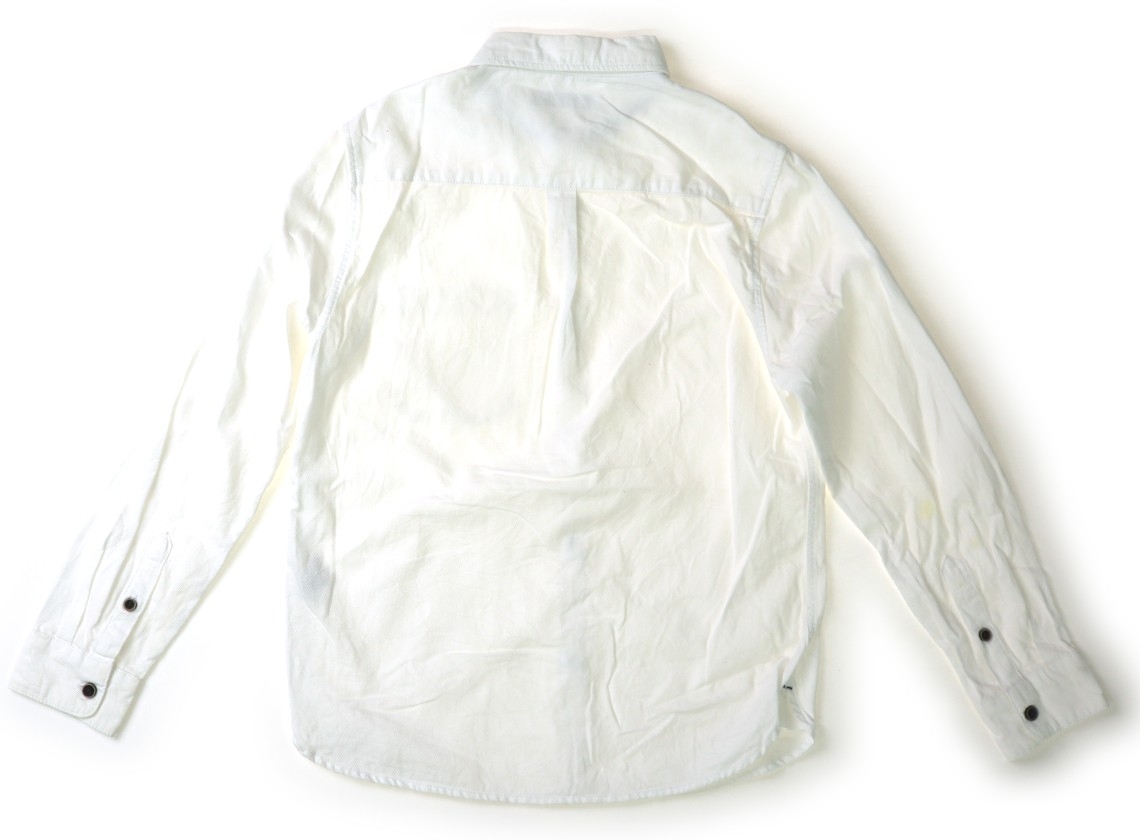 薄っすらと型押し加工でドット柄の様な跡があります。実際のサイズ表記は10/140cmです。右ひじ付近に黄色っぽいシミが複数あります。