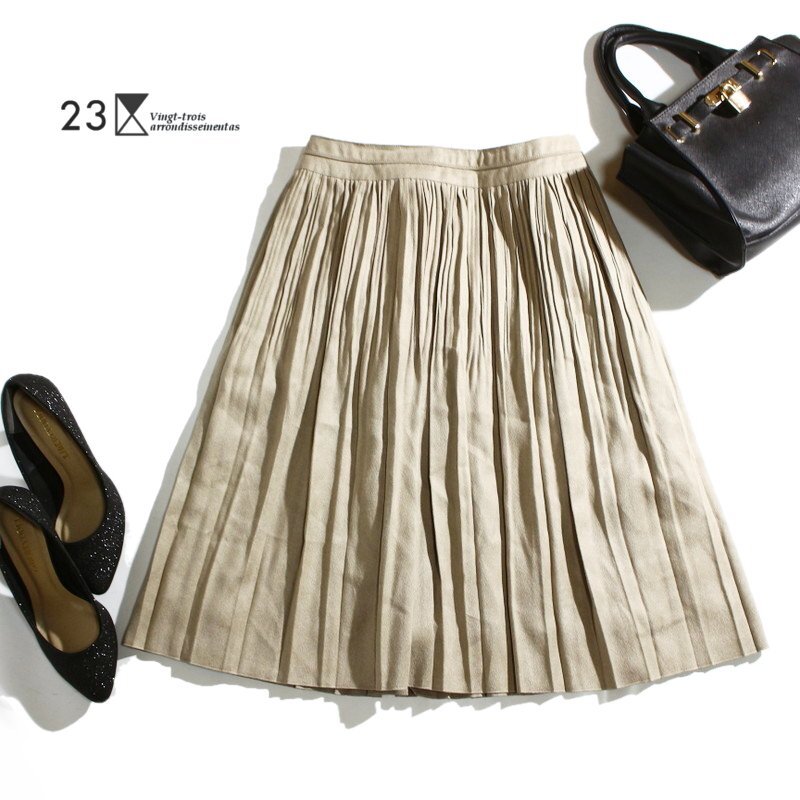 美品 23区 株) オンワード樫山 秋 冬 シワプリーツ スエードタッチ 膝下丈 スカート 9号 38 グレイッシュ ベージュ 上品 スカート レザー