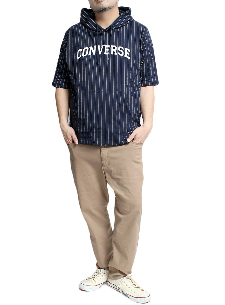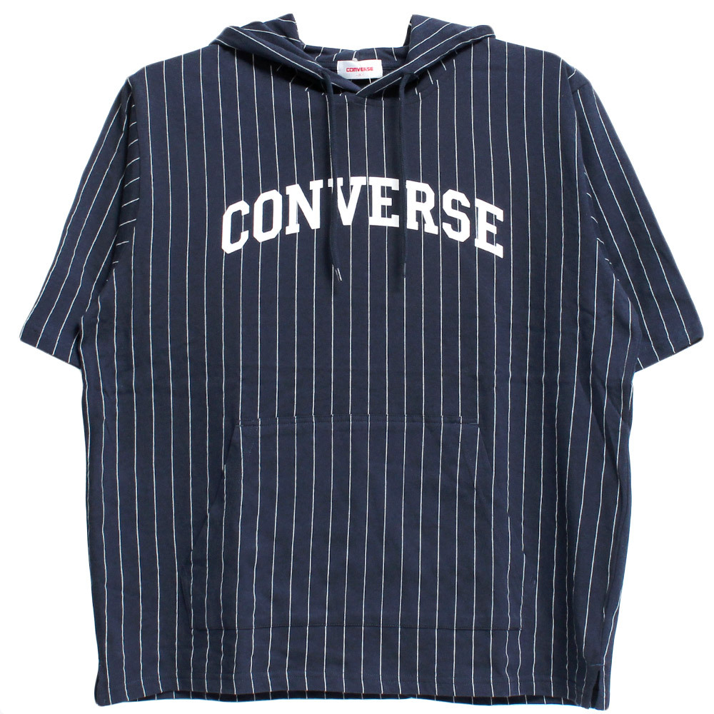 商品説明 | スニーカーでお馴染み、「CONVERSE/コンバース」のプリントデザインを利かせたストライプ柄の半袖プルオーバーパーカーです。 |