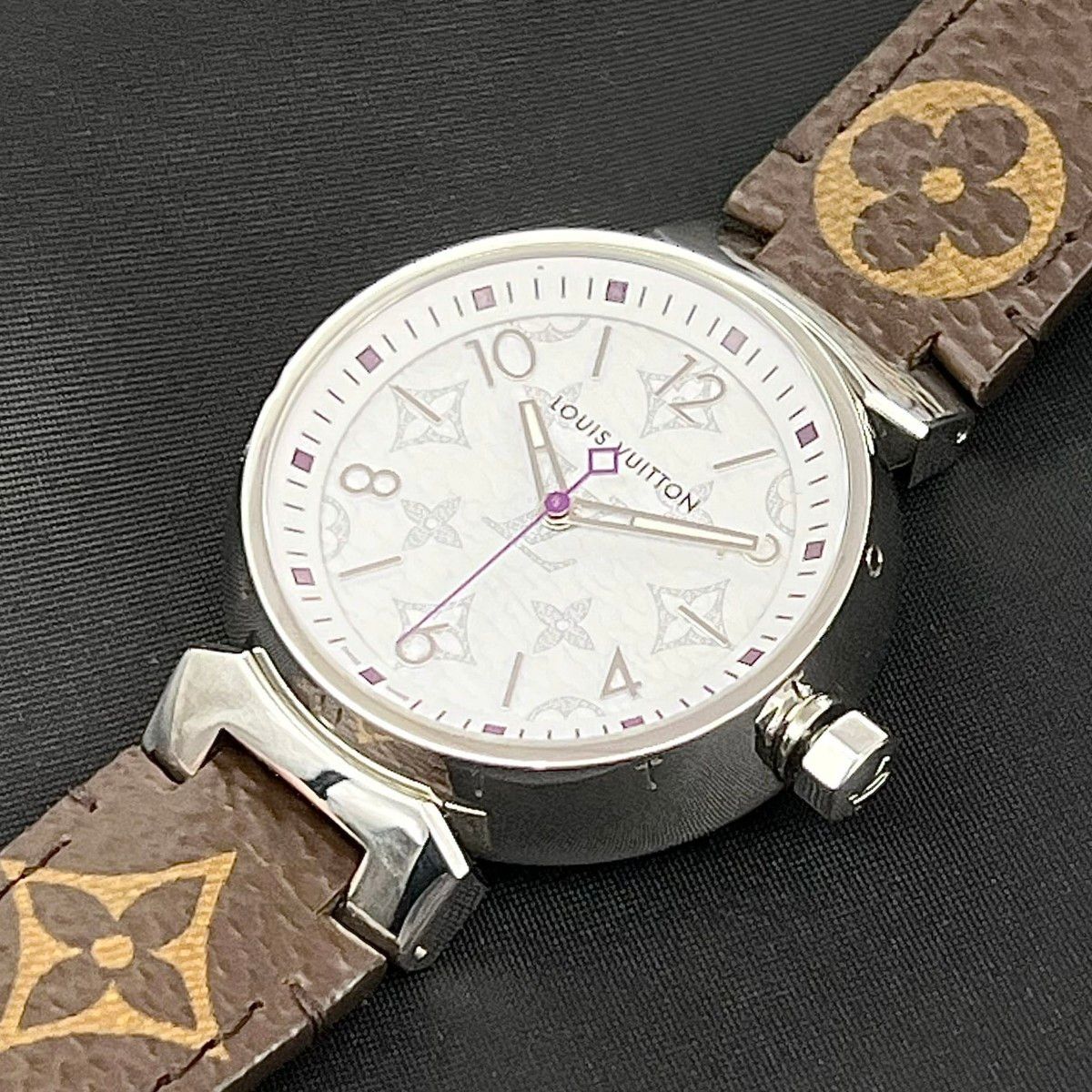 ホワイトの文字盤にはモノグラム・フラワーが繊細に刻まれ、
