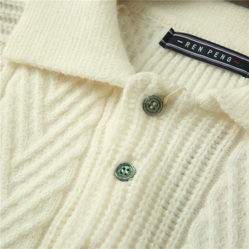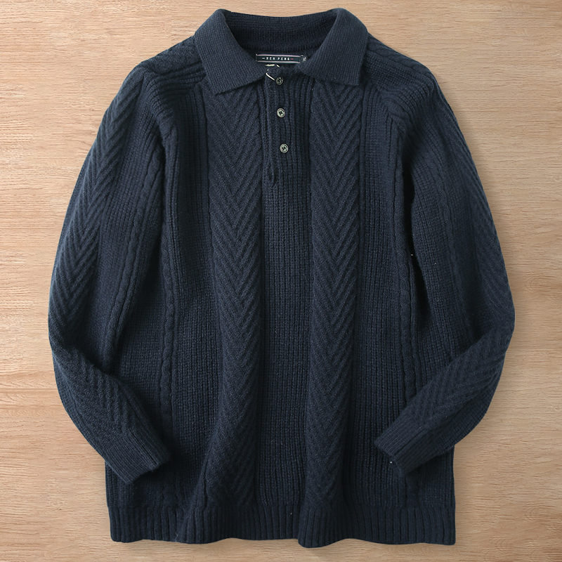 Y6360-M ネイビー 新品 ウール混 ジャガード 肌触りが良い ニット セーター 折り襟 柔らか 暖かさ 秋冬 厚手 メンズ カジュアル トップス