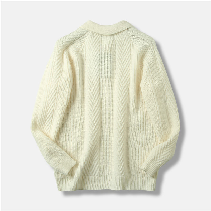 Y6360-M ネイビー 新品 ウール混 ジャガード 肌触りが良い ニット セーター 折り襟 柔らか 暖かさ 秋冬 厚手 メンズ カジュアル トップス
