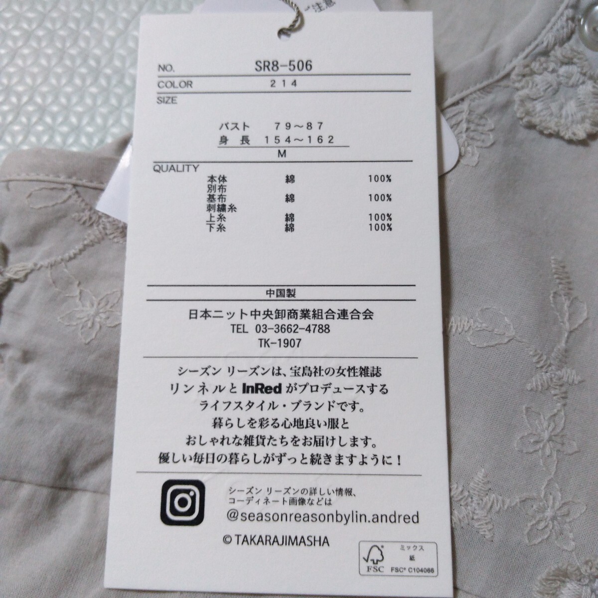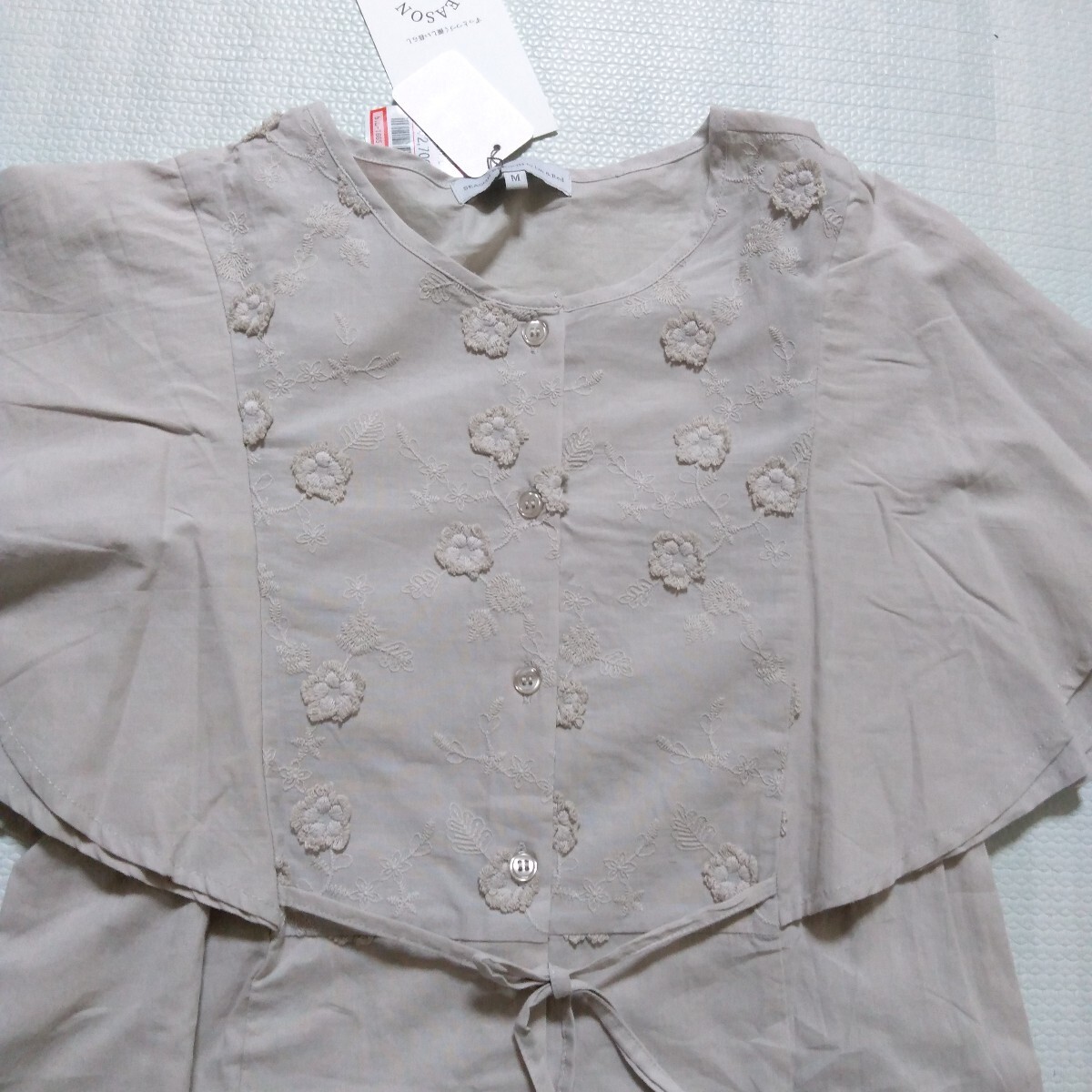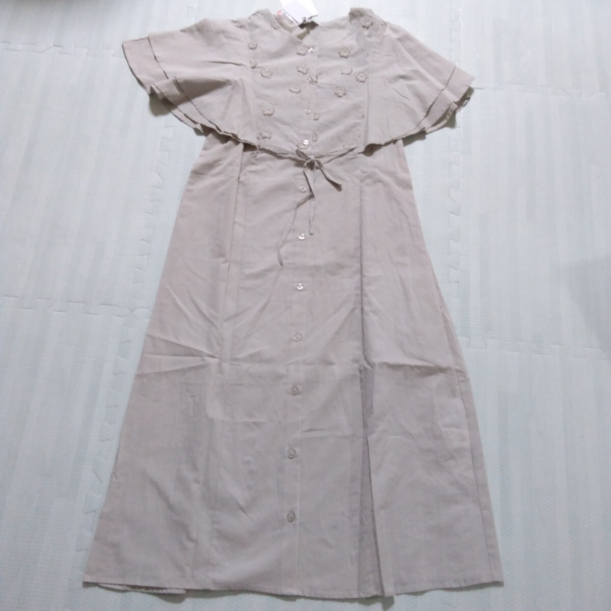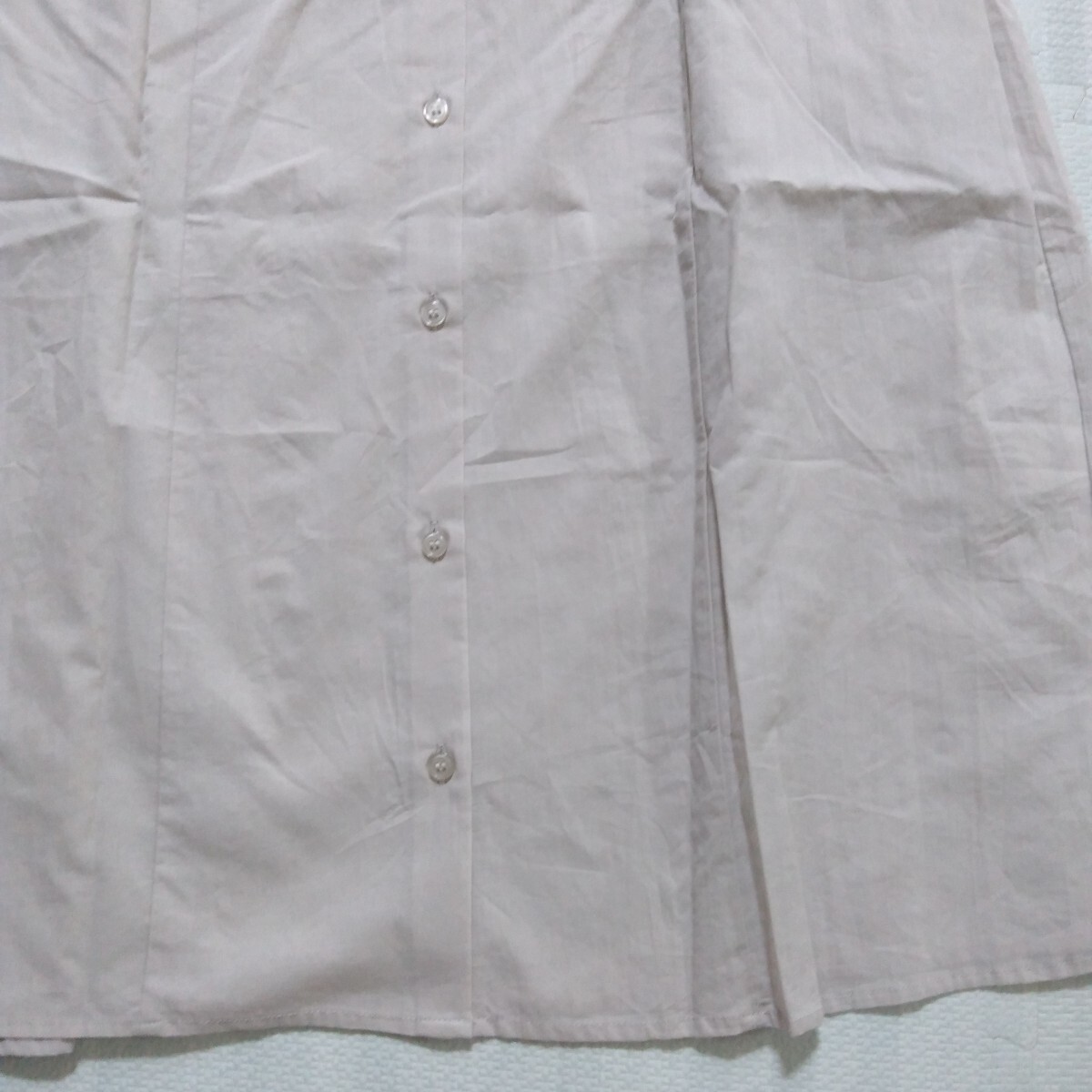 色はグレージュ、サイズはM、着丈114cm、わきの下で横幅47cmくらい。