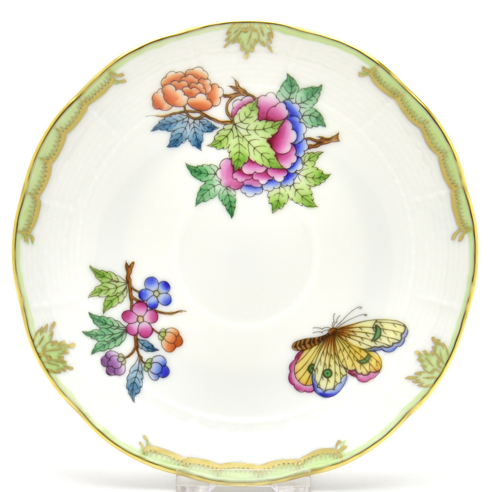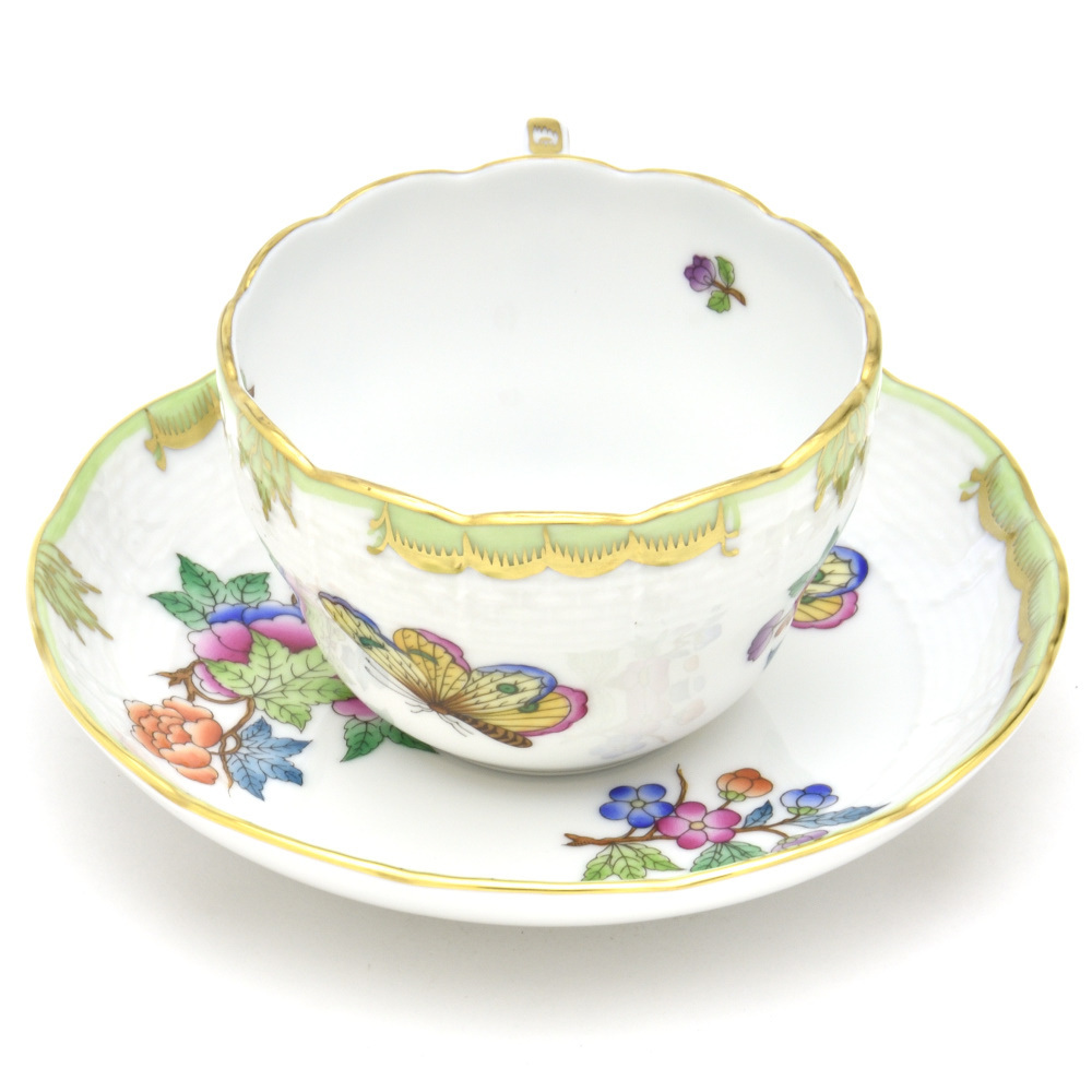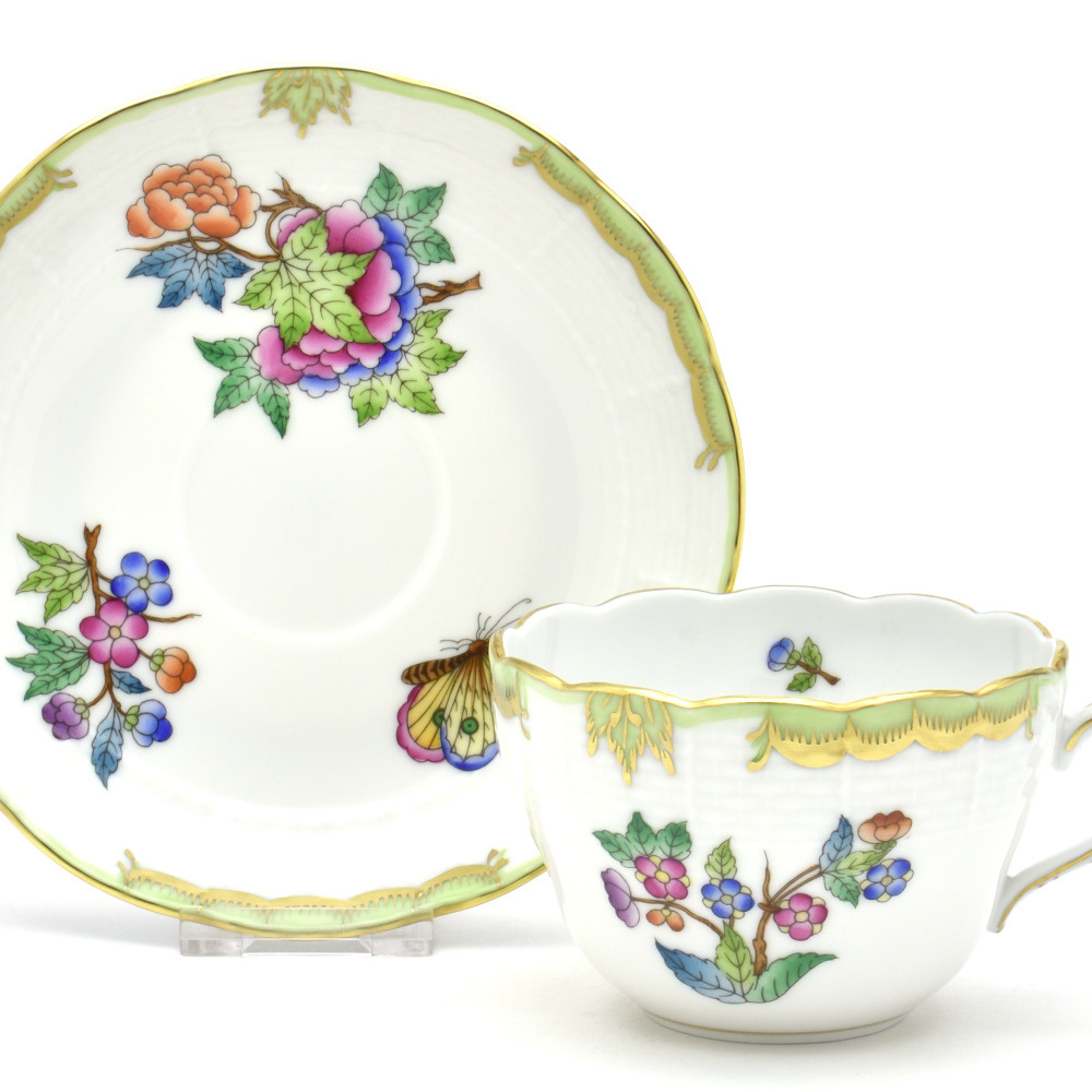 | ハンガリーの名窯ヘレンドの代表作の一つ。1848年頃創作されたこの作品のオリジナルは1851年ロンドンの万国博覧会でヴィクトリア女王にディナーサービスを買い上げられヘレンドのパターンの中でも最も有名なものとなり、以来ヴィクトリアと名づけられました。ハンドペインティングで描かれた縁取りの金彩、グリーンの暈し、グラデーションを効果的に異なった花や蝶をモチーフに使ったバリエーションでヘレンド・ヴィクトリアブーケ装飾バリエーションの世界が広がります。※ヘレンド作品はハンドペインティングで描かれている為、色合い、風合い等一点一点、絵柄の細部が微妙に異なります。 ハンガリーの名窯ヘレンドは1826年、首都ブダペストから120キロ離れた寒村ヘレンド村に誕生した。その時代「貴族の中の貴族」と称されたハプスブルク家のフランツ・ヨゼフ皇帝の庇護の下、ヨーロッパ中の王侯、貴族の愛好家を顧客として発展を遂げた小さな窯ヘレンドは今日、頑なに手造り拘る名窯ヘレンドとして名声を高めています。 | |||
