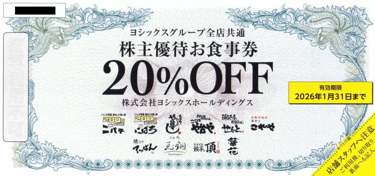 ・ヨシックスグループグループ全店共通株主優待お食事券20OFF×1枚となります。
